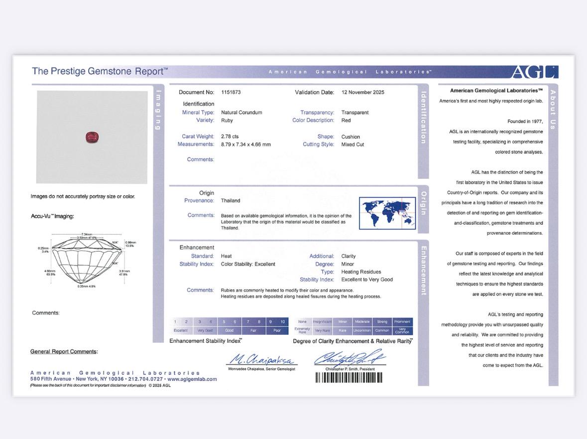Ruby's can be extremely difficult to buy! Are they real? Are they led glass filled? What are the treatments? Where are they from? All questions that matter when you want a, "real natural" Ruby. Well we've taken care of that worry. This stone includes the very best colored Gemstone lab and origin report. AGL is the best colored Gemstone lab in the world and the only one we use. It indicates the following