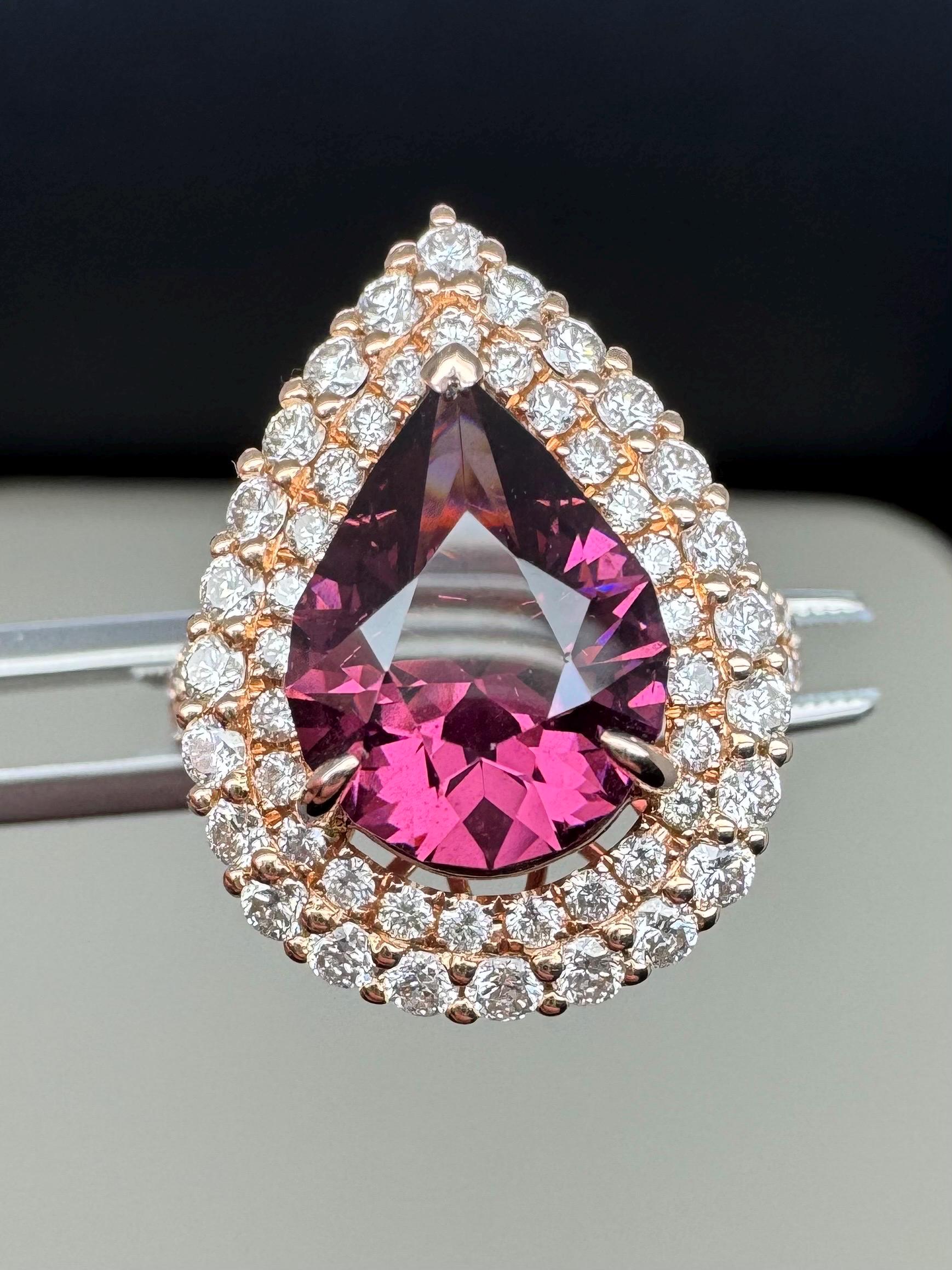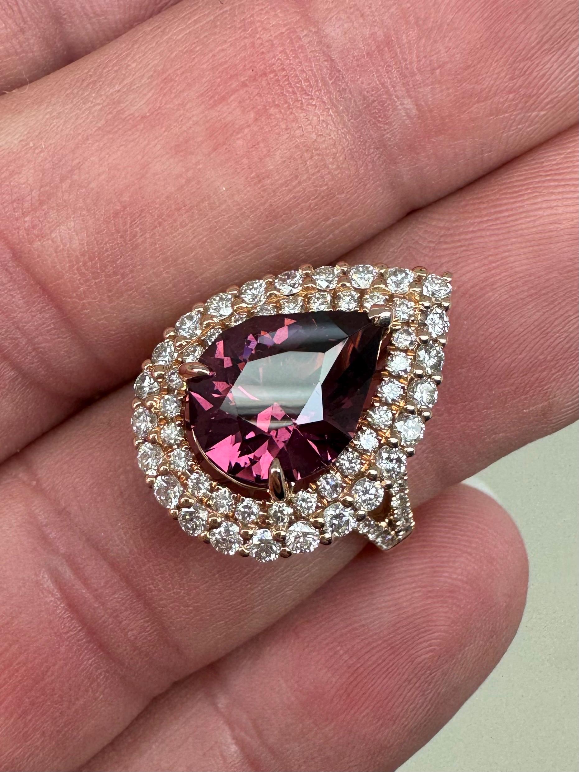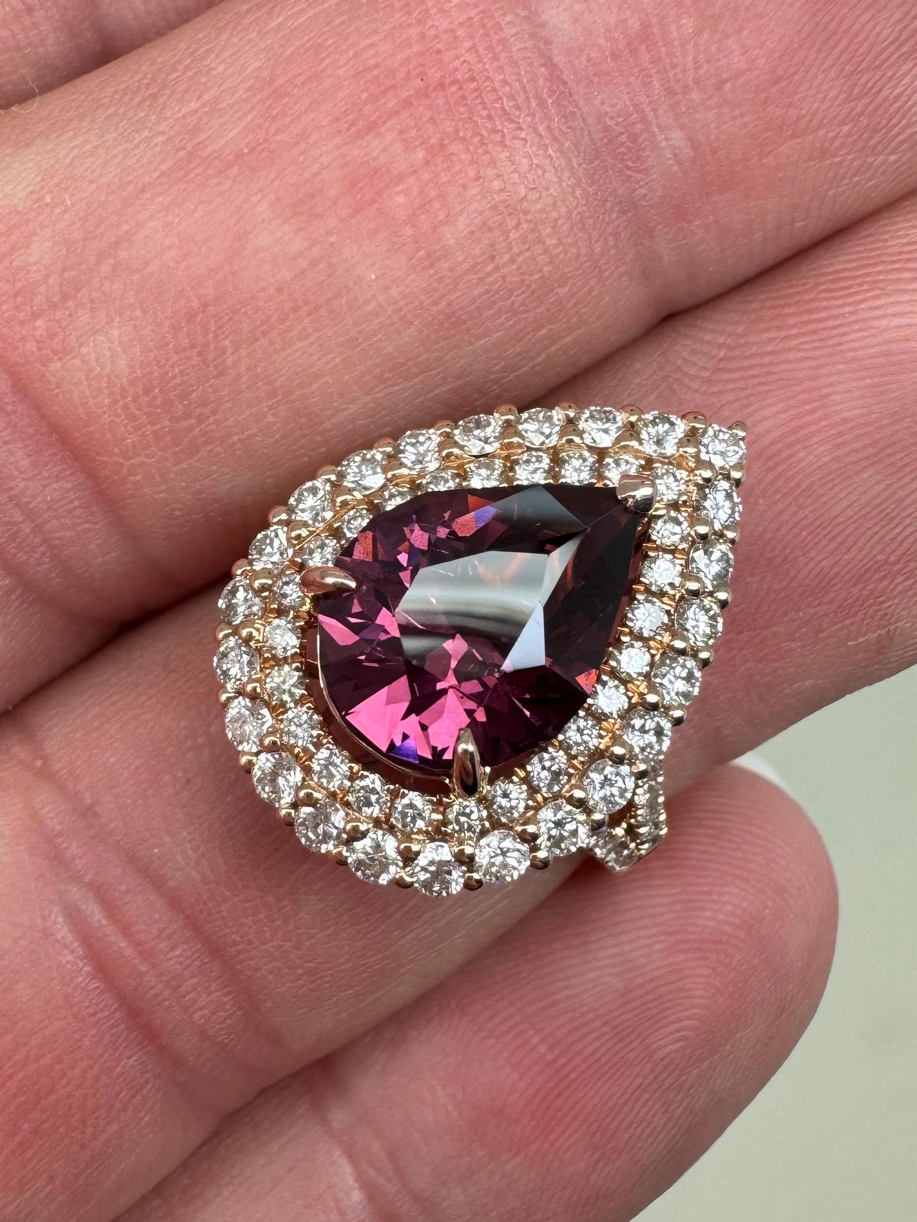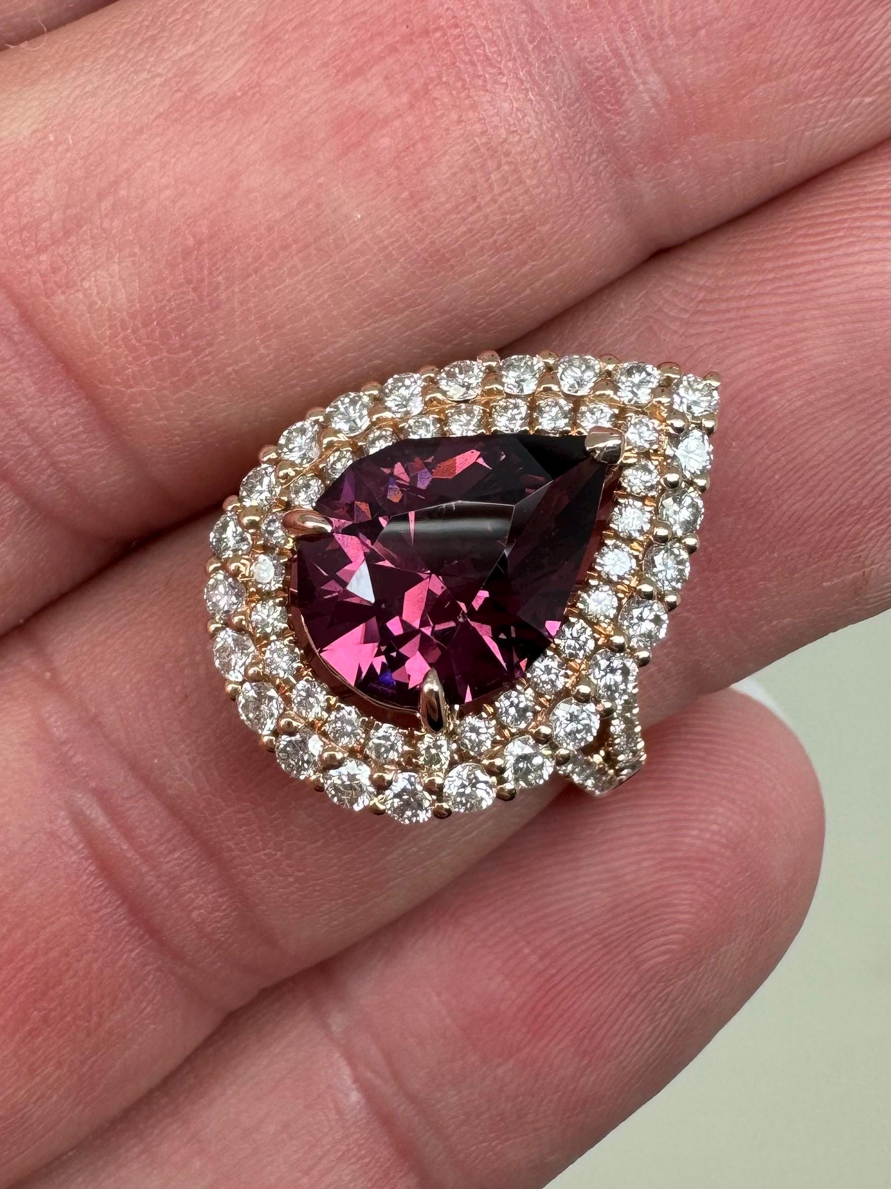 This is a precision cut 7ct rhodolite Garnet in a beautiful double halo mounting with 1.5ct natural diamonds. A true custom.