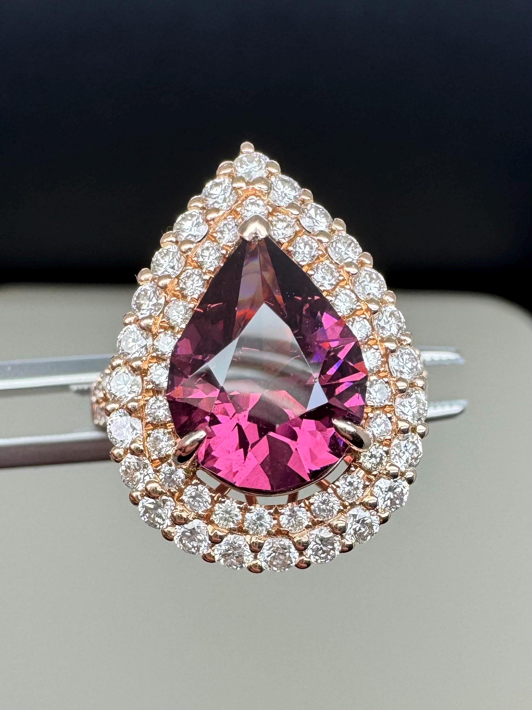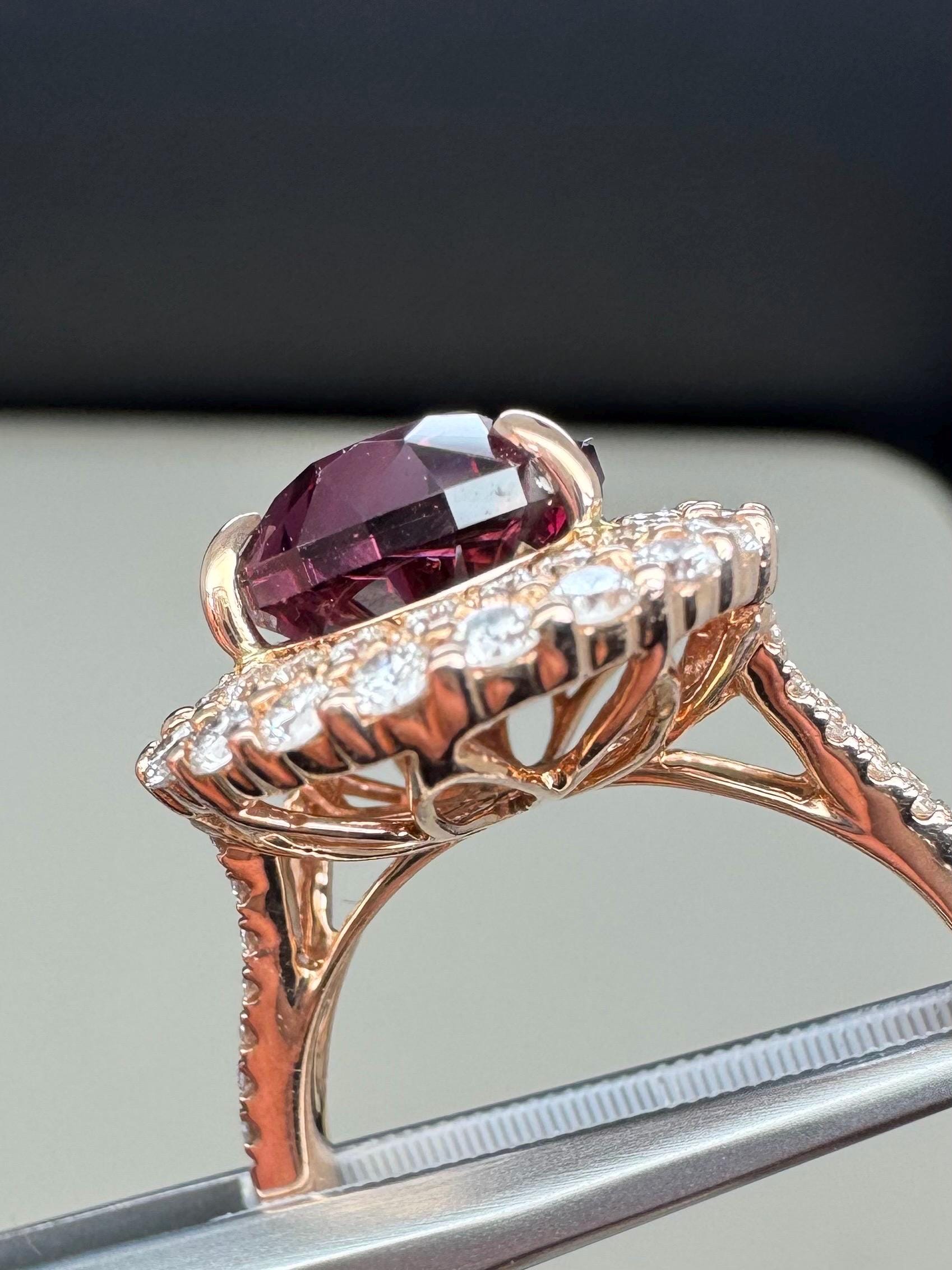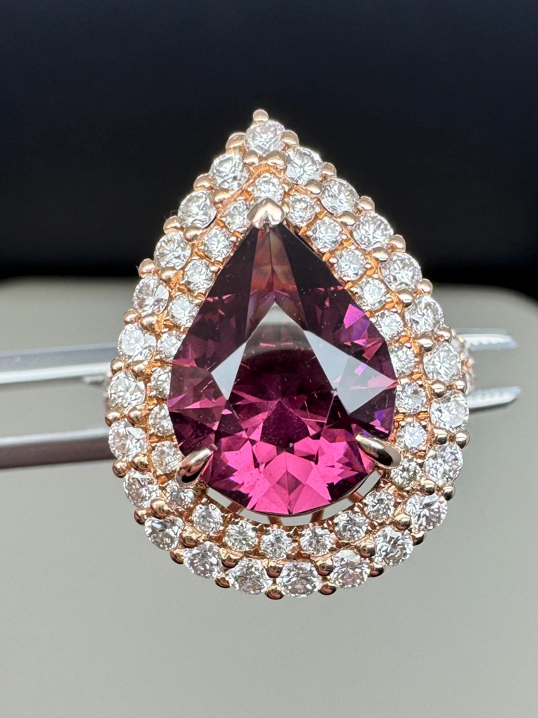 This is a precision cut 7ct rhodolite Garnet in a beautiful double halo mounting with 1.5ct natural diamonds. A true custom.