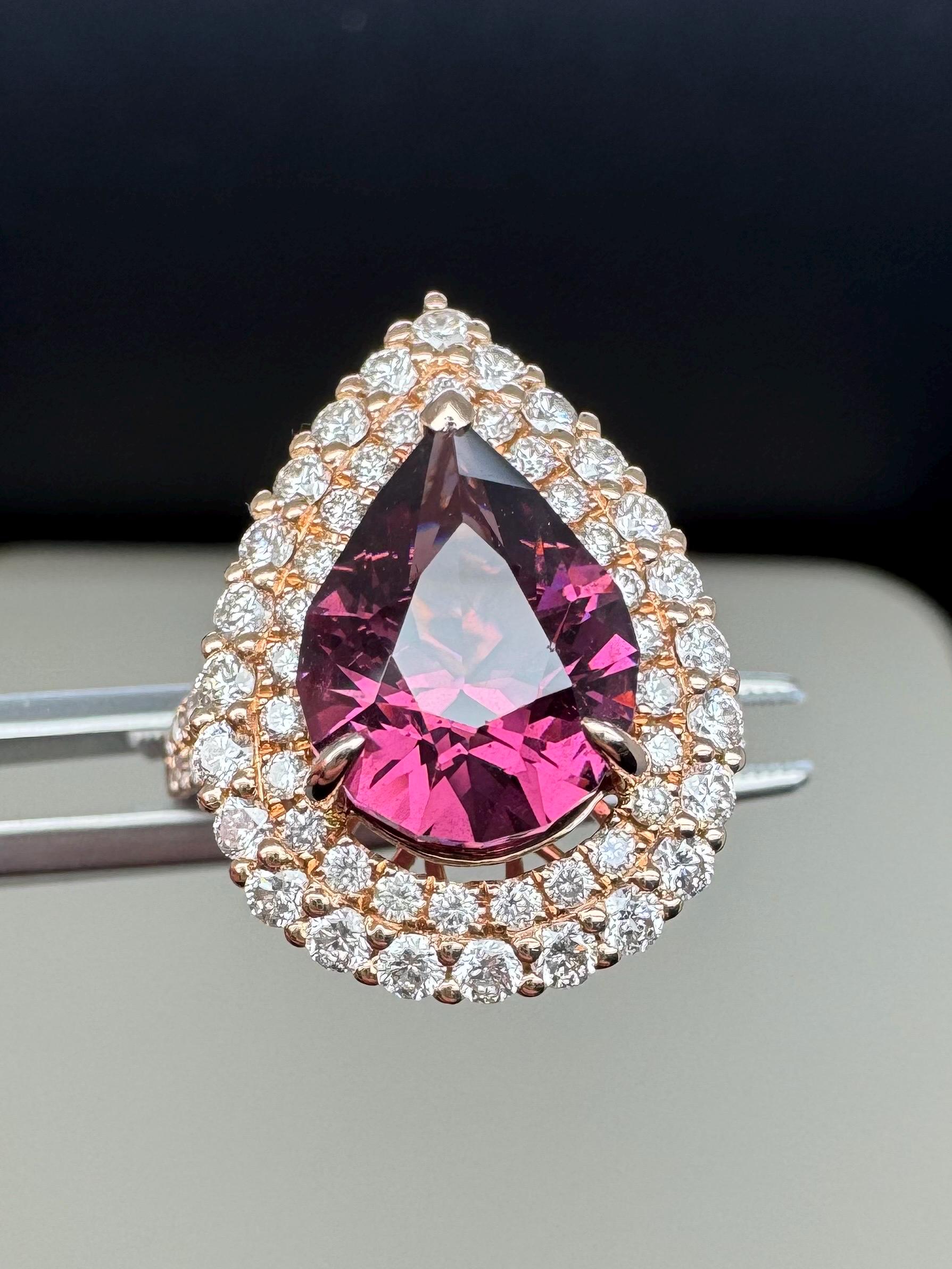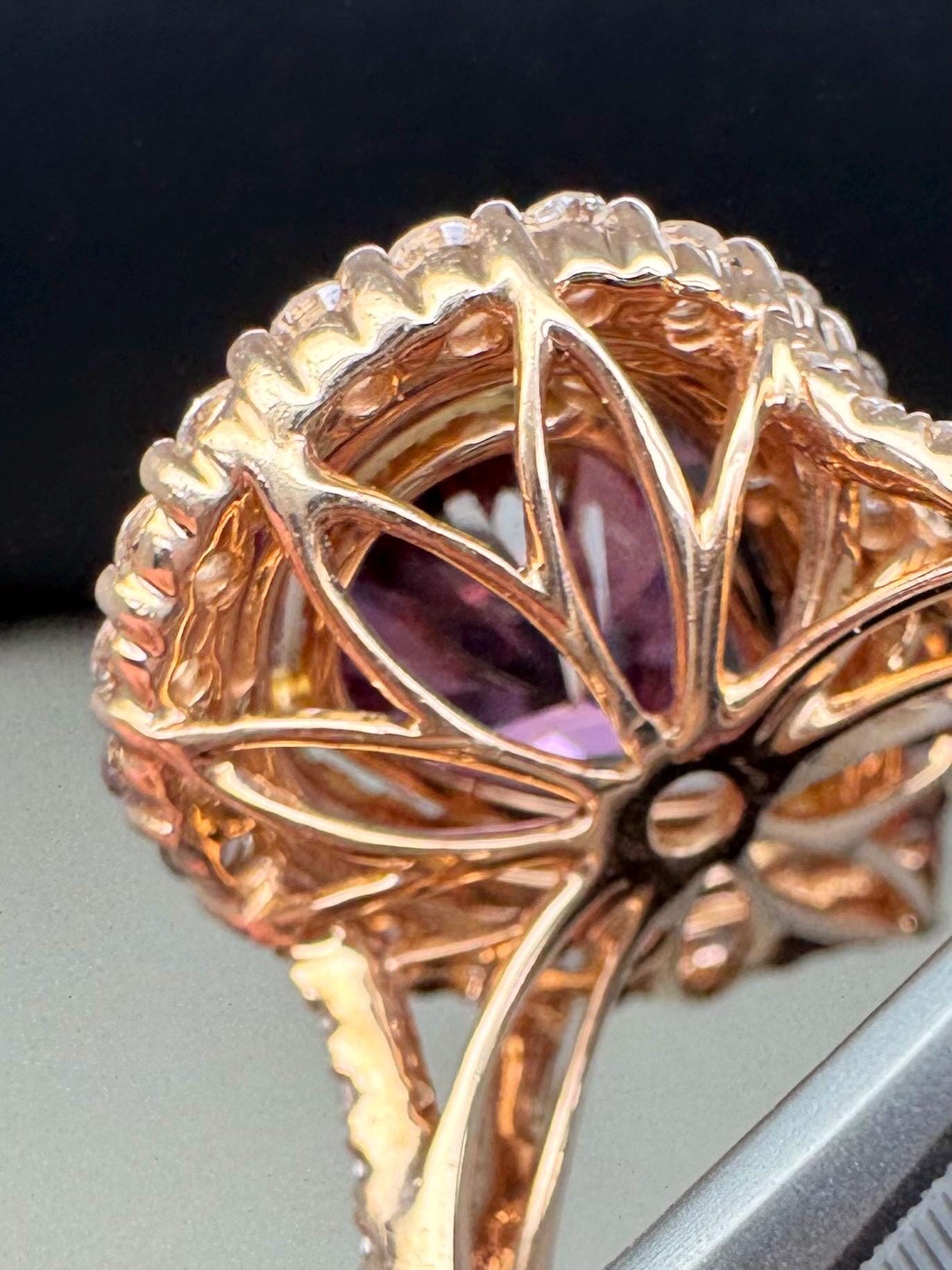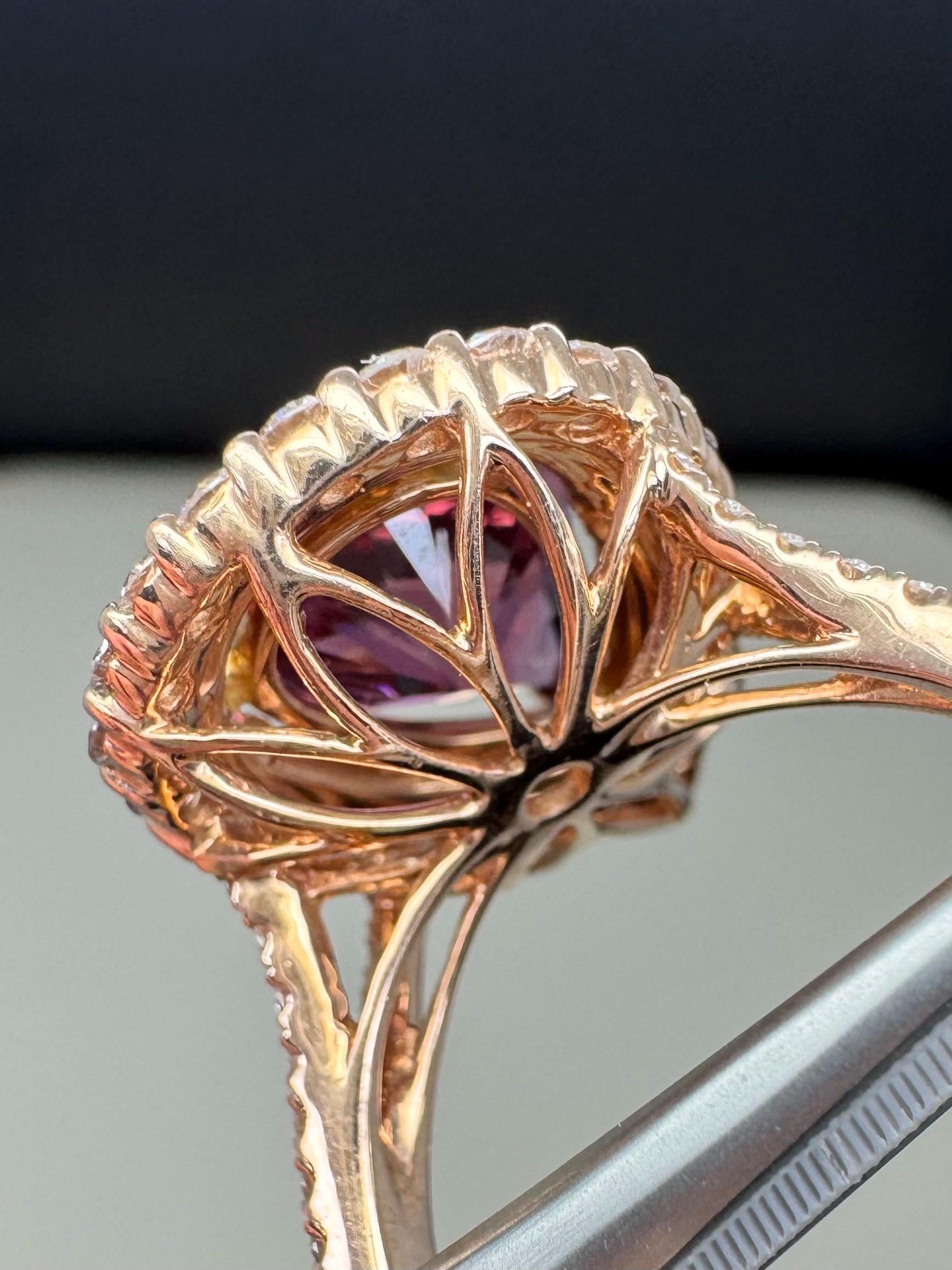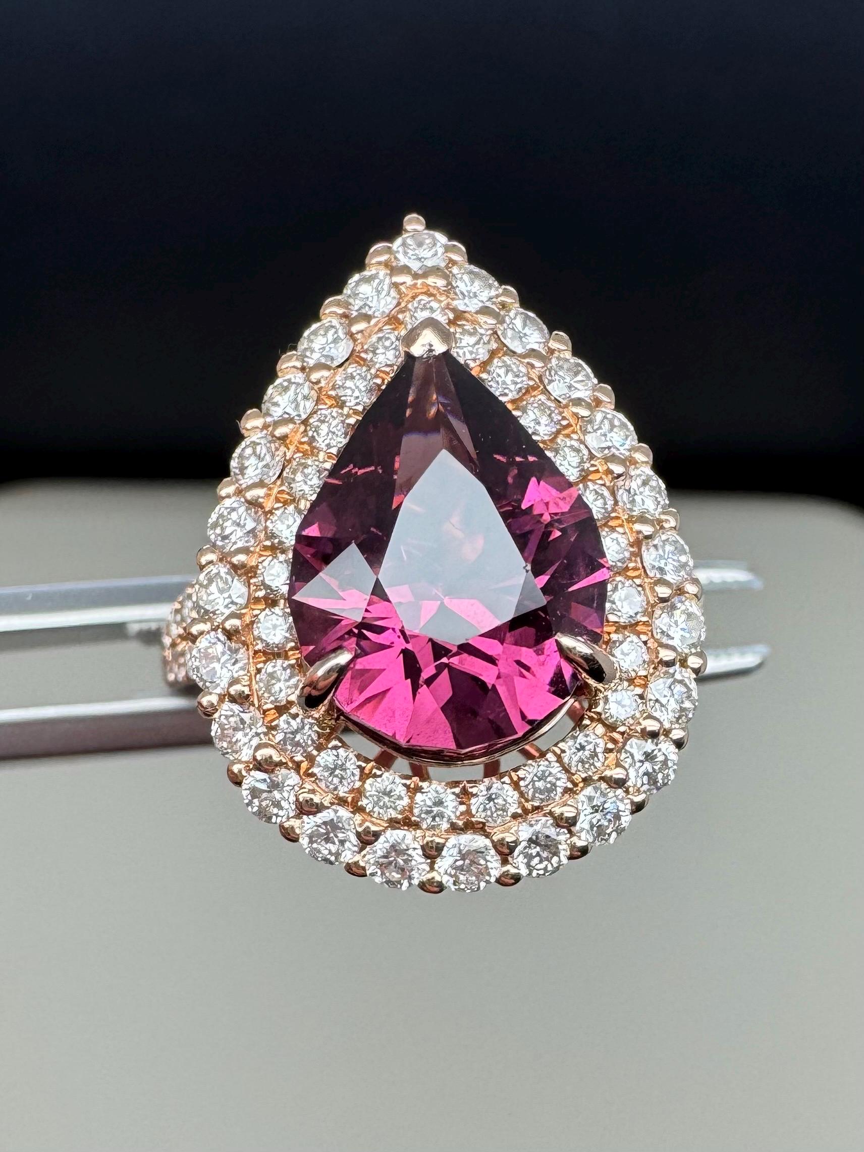 This is a precision cut 7ct rhodolite Garnet in a beautiful double halo mounting with 1.5ct natural diamonds. A true custom.