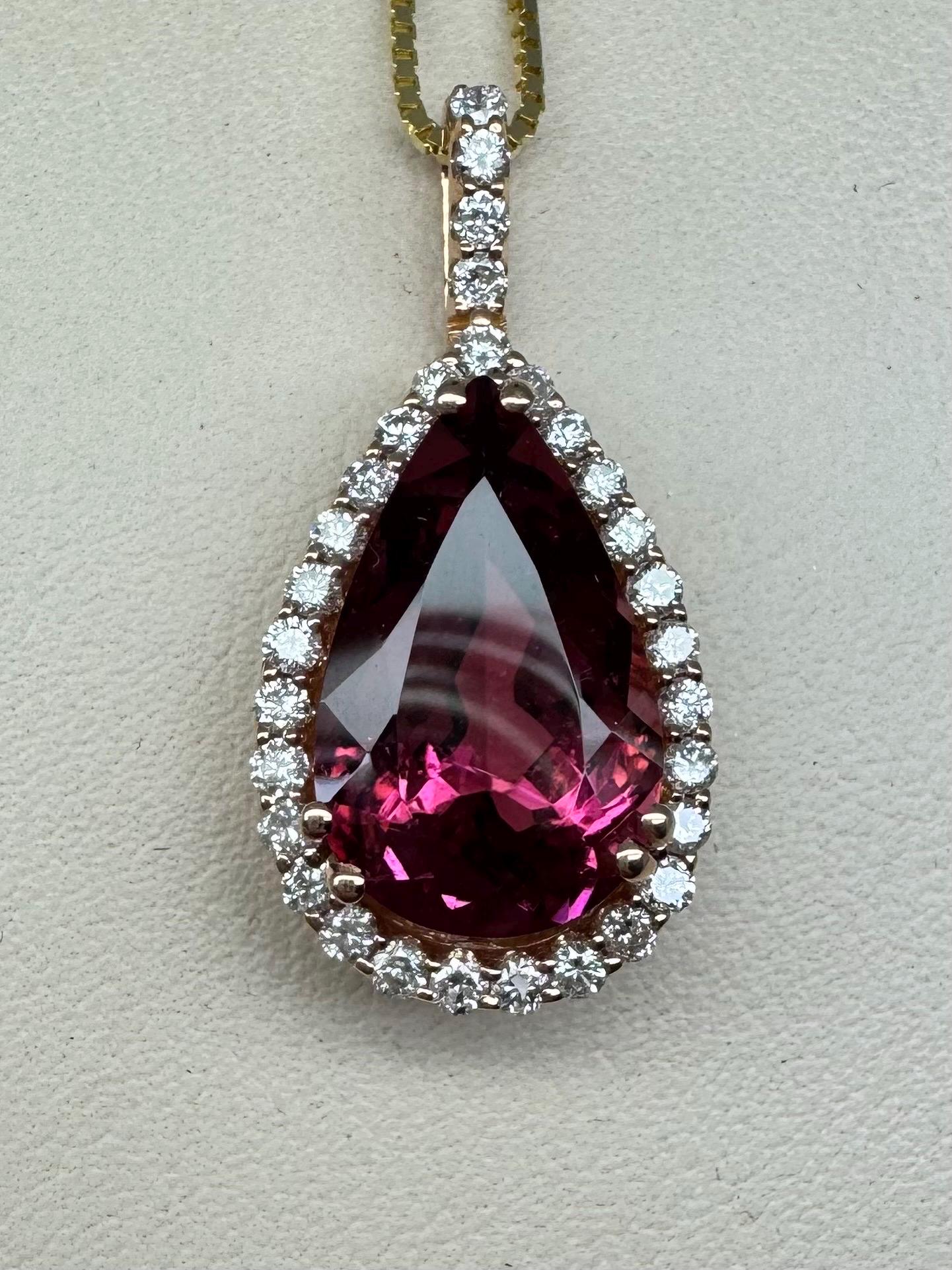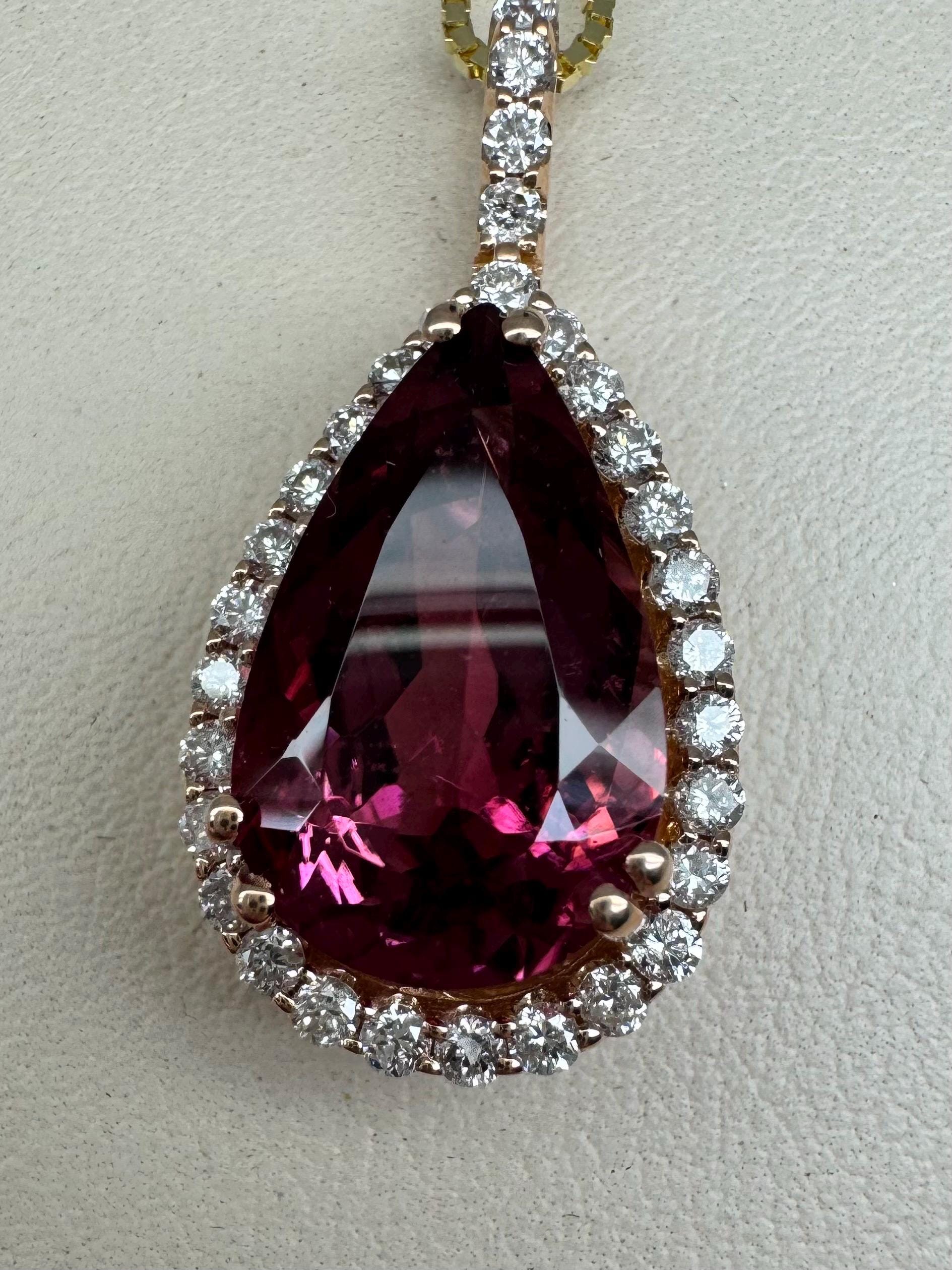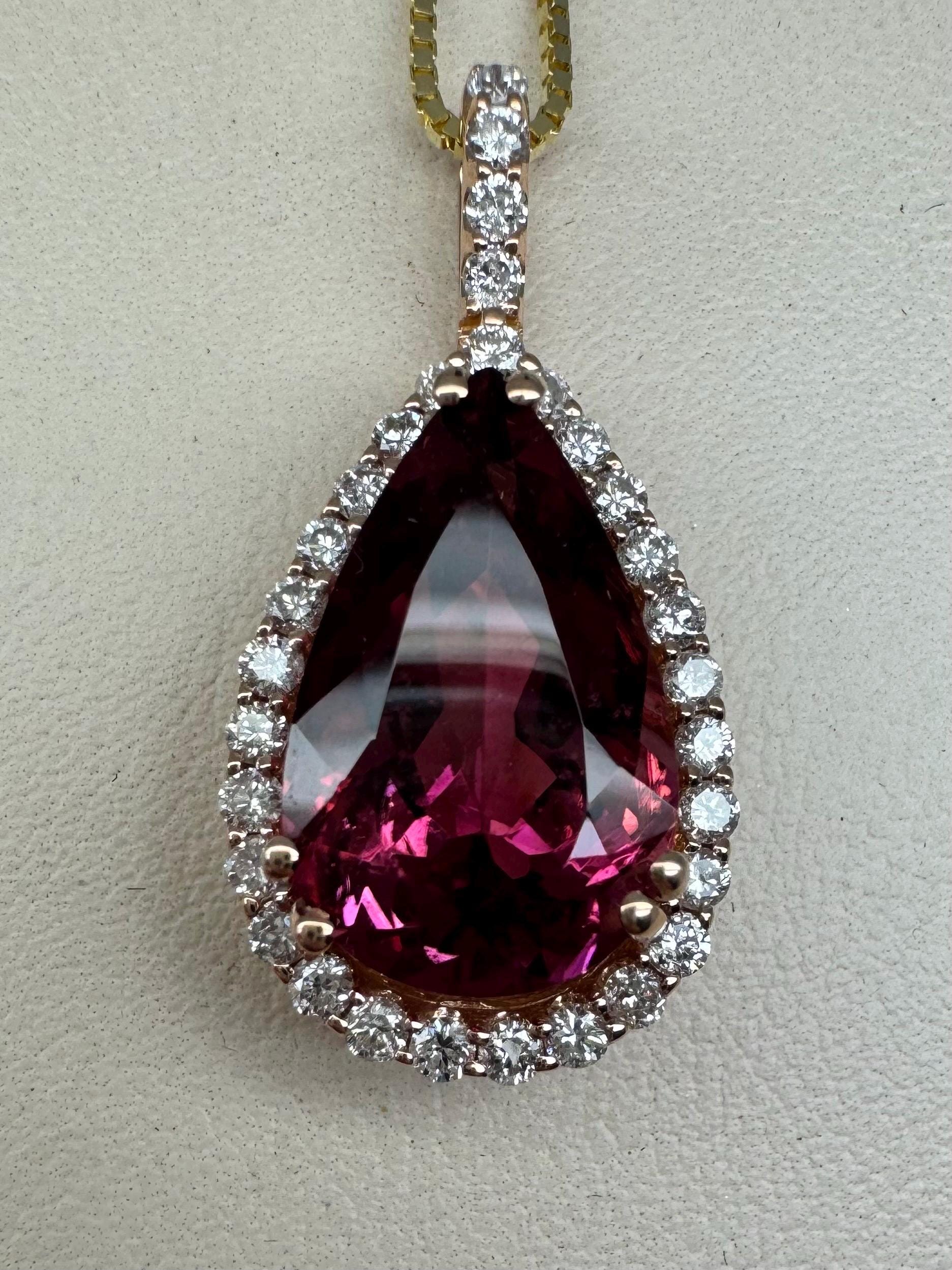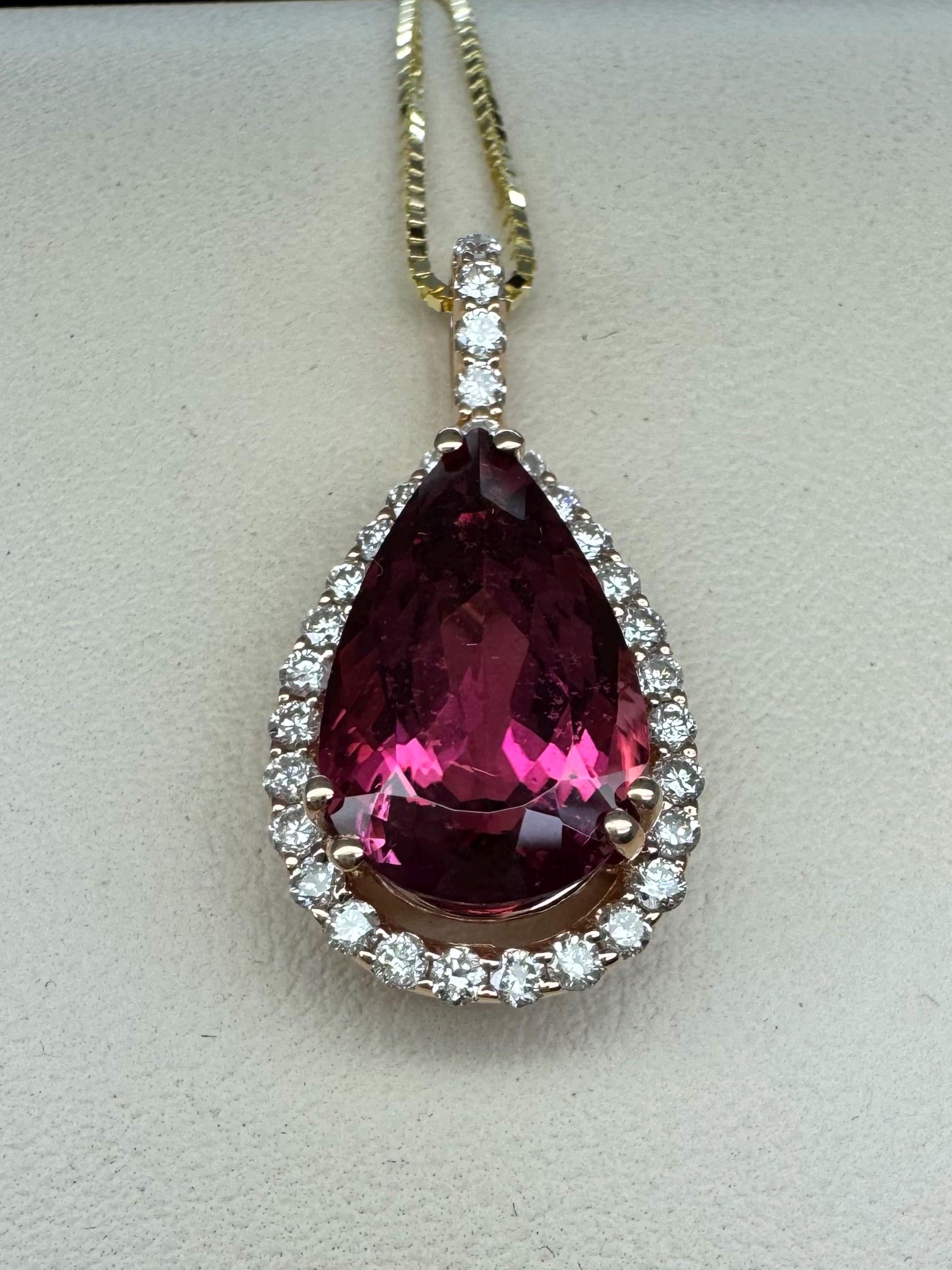 Seven carat brazilin rubellite Tourmaline. 3/4 carat natural diamond accents. All in 14k gold.
