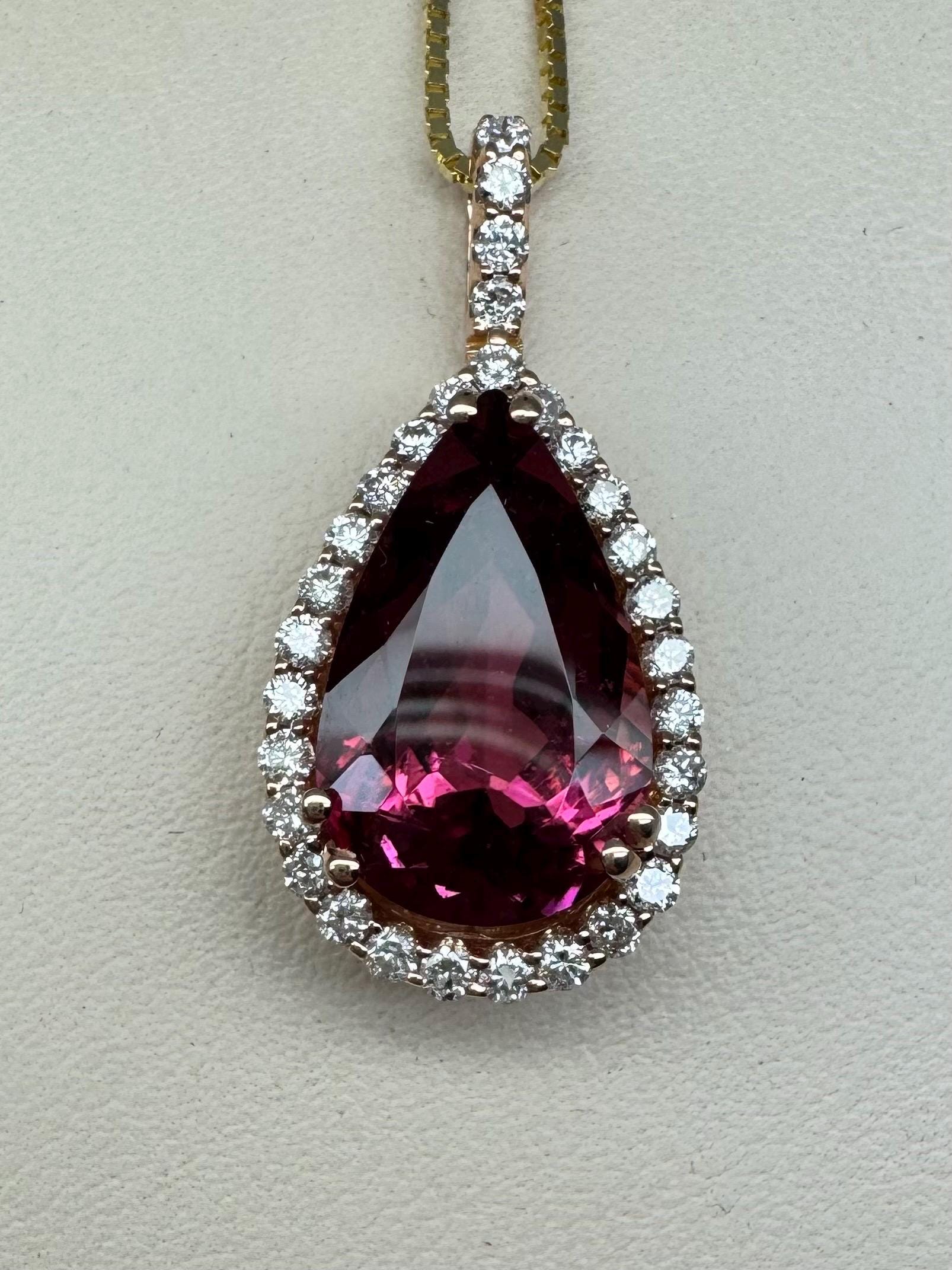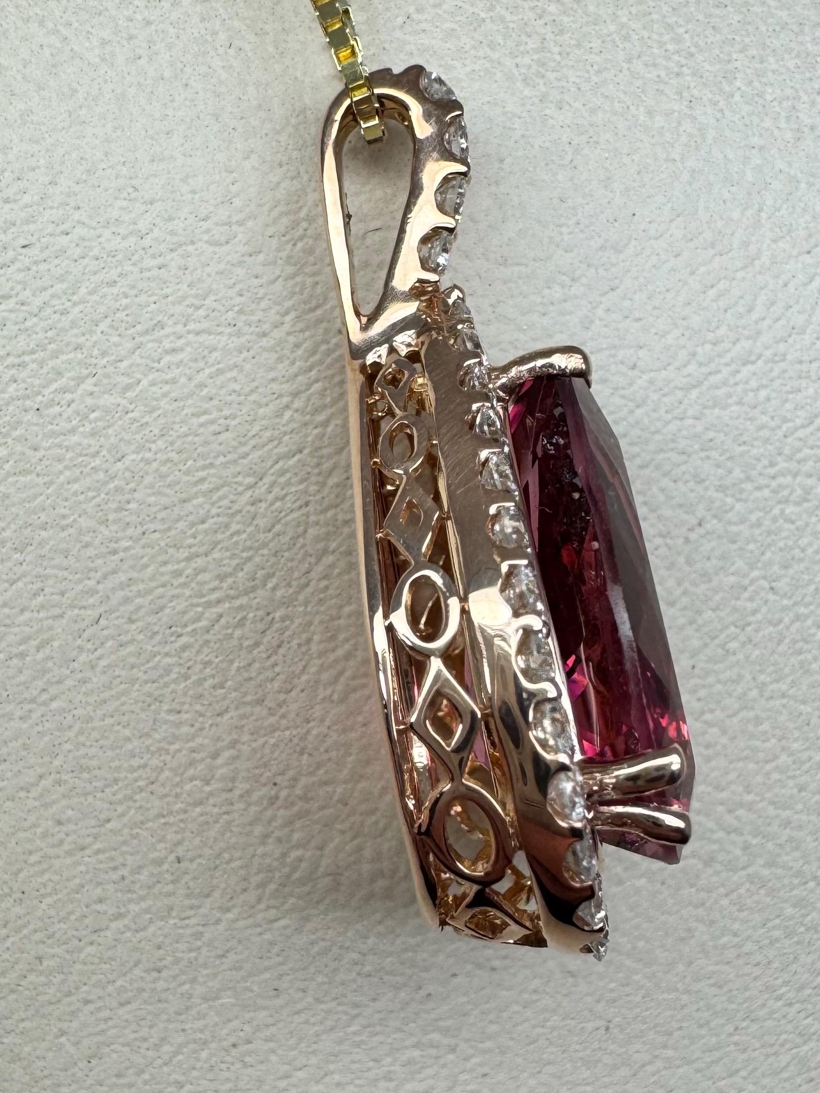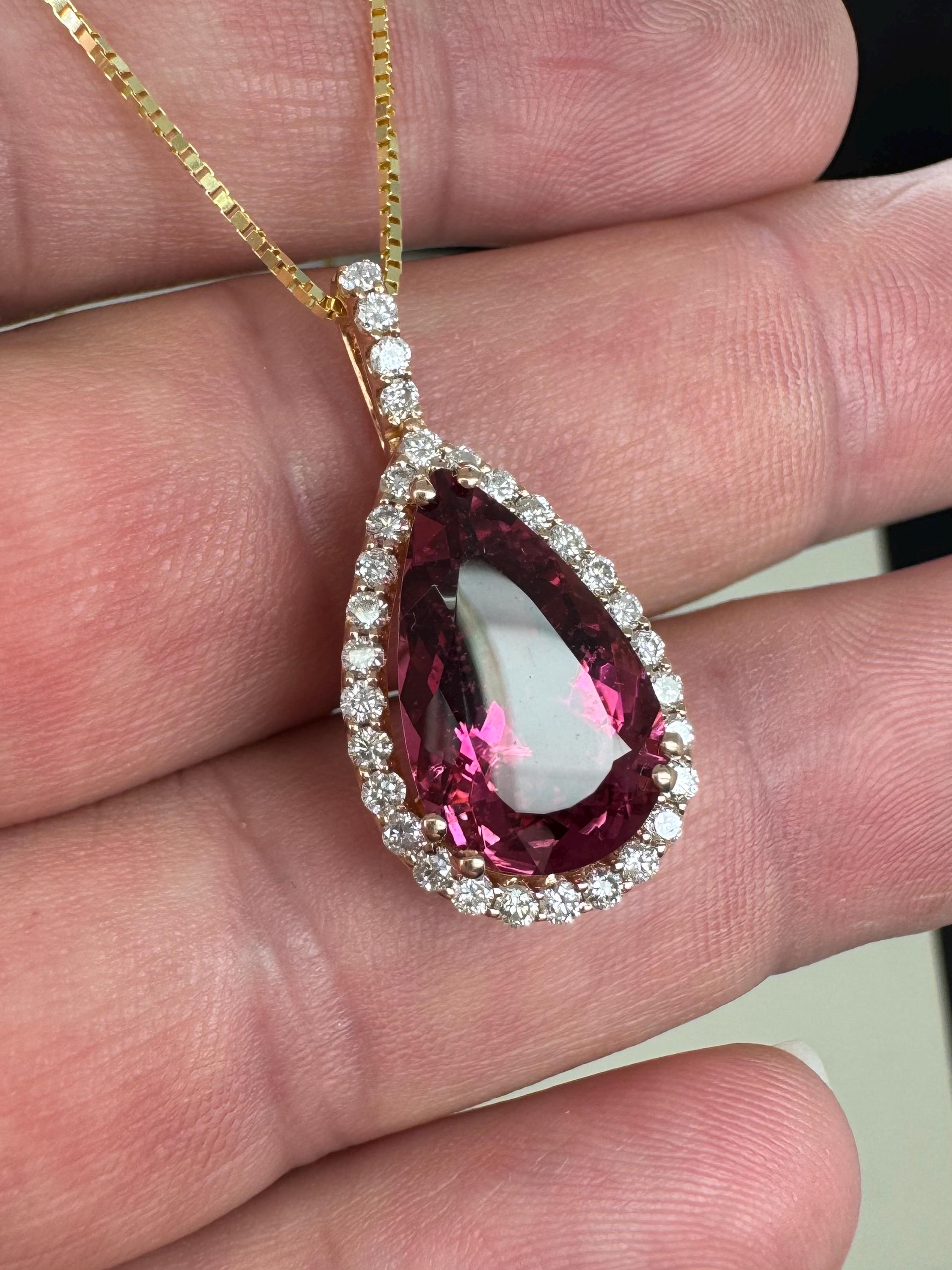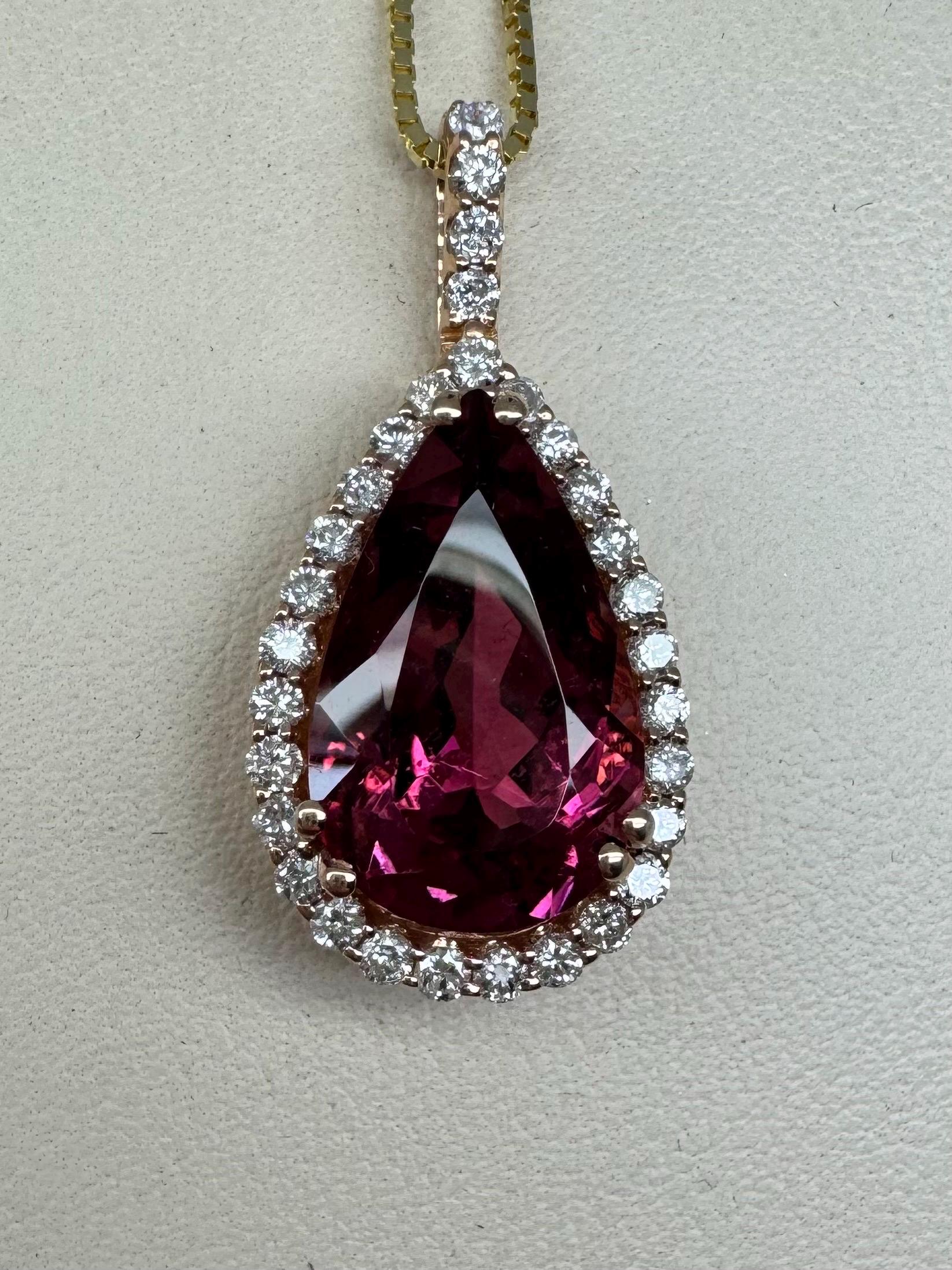 Seven carat brazilin rubellite Tourmaline. 3/4 carat natural diamond accents. All in 14k gold.