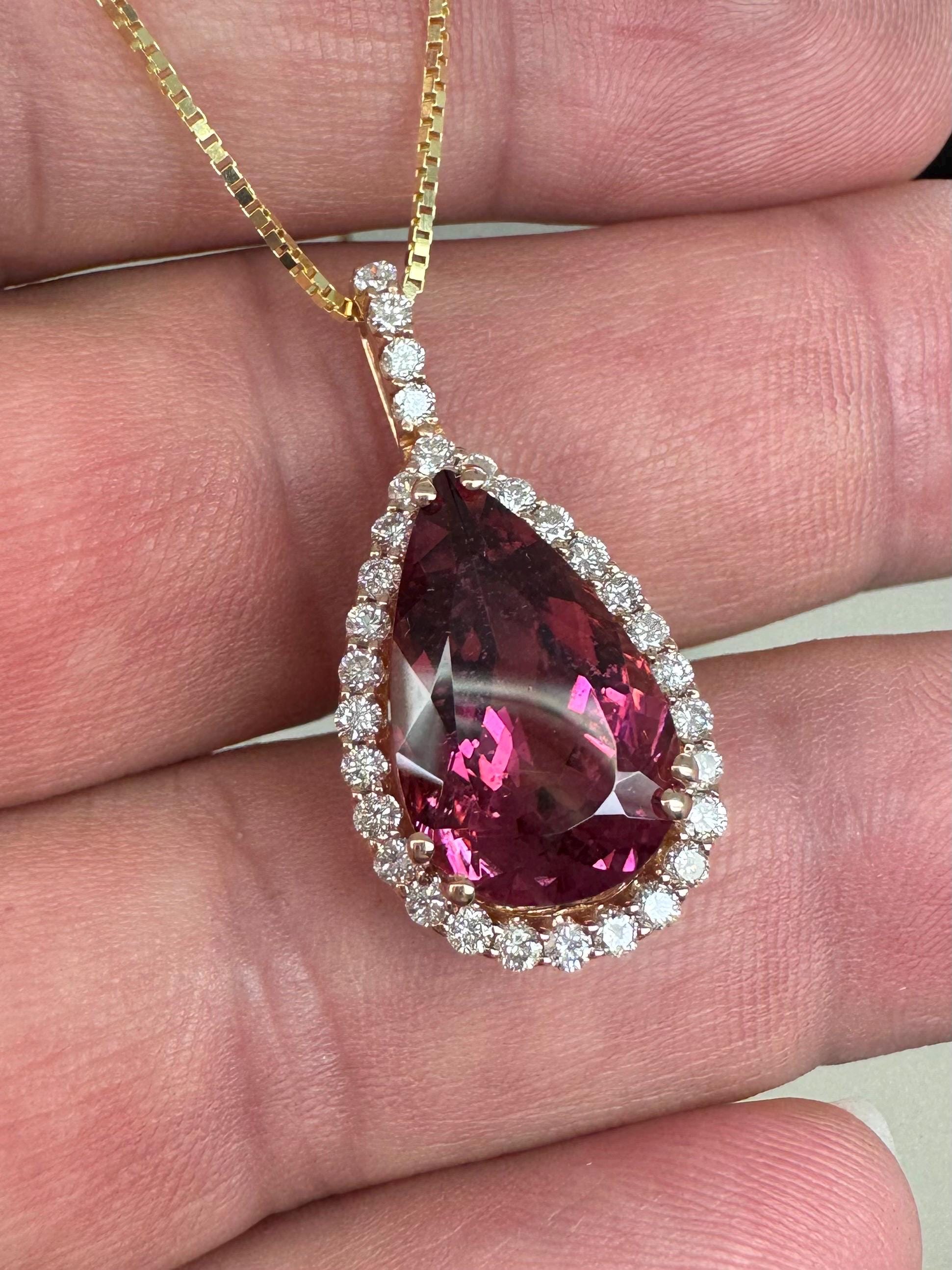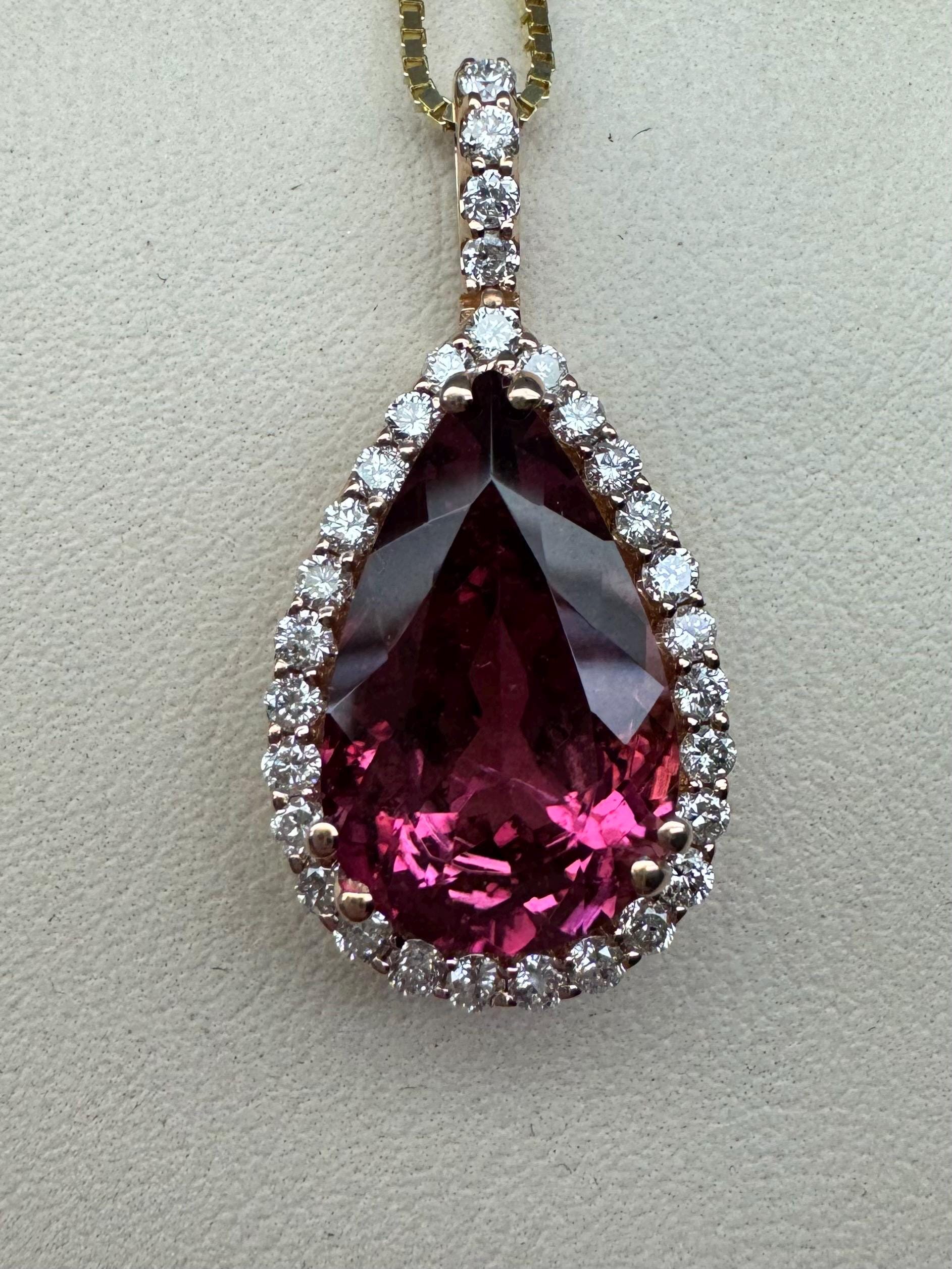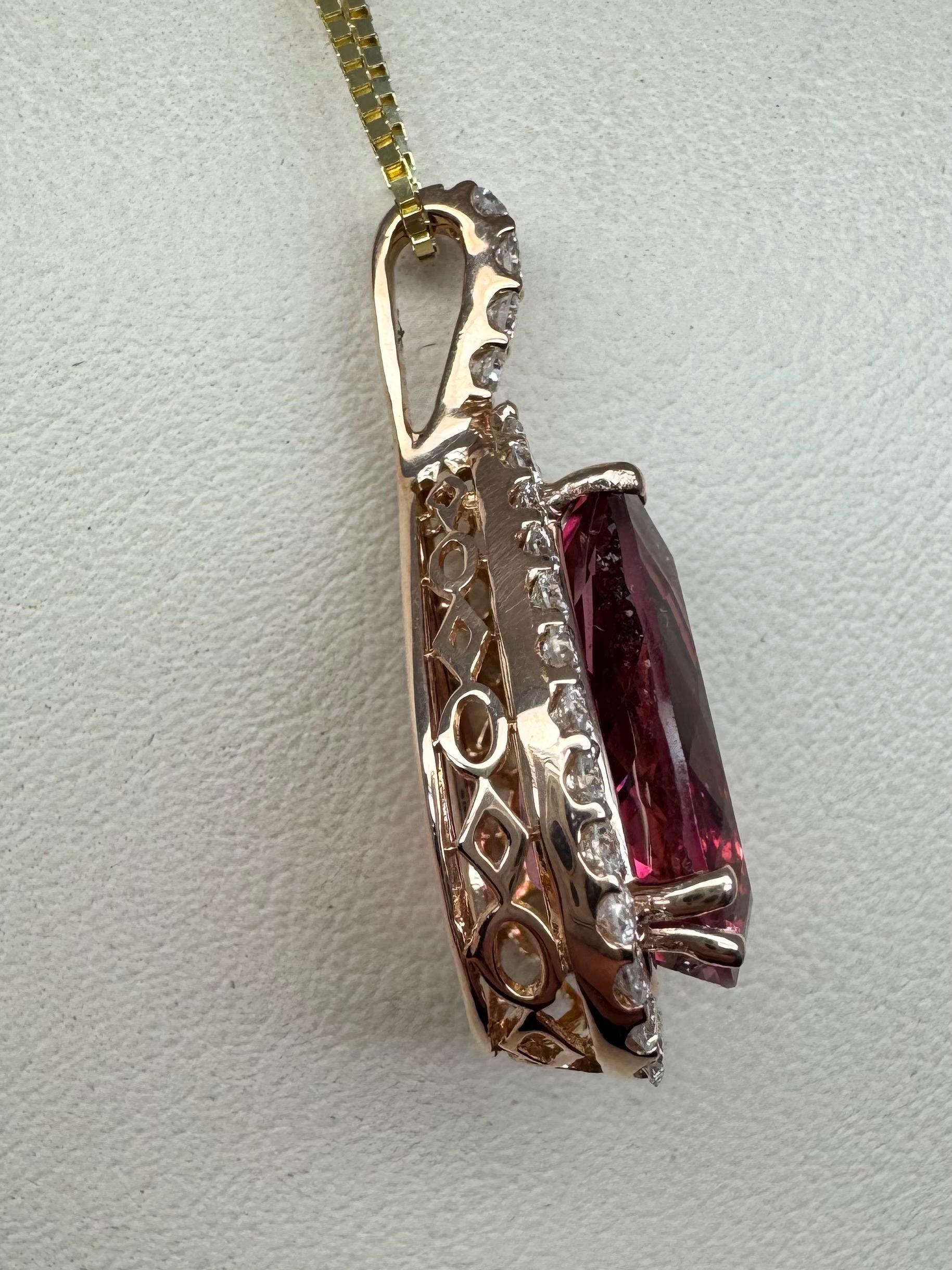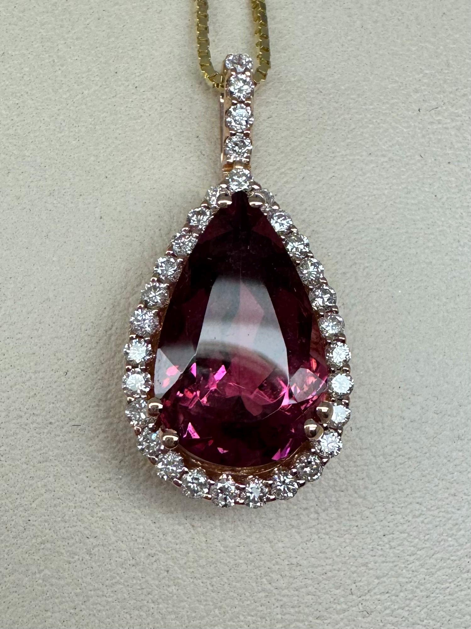 Seven carat brazilin rubellite Tourmaline. 3/4 carat natural diamond accents. All in 14k gold.