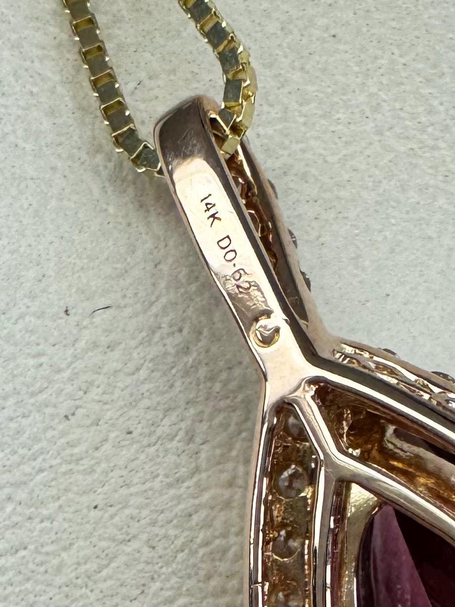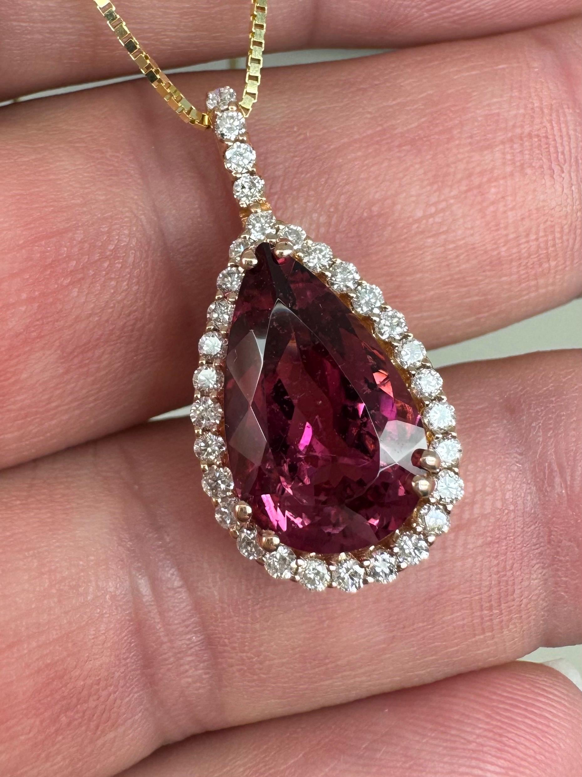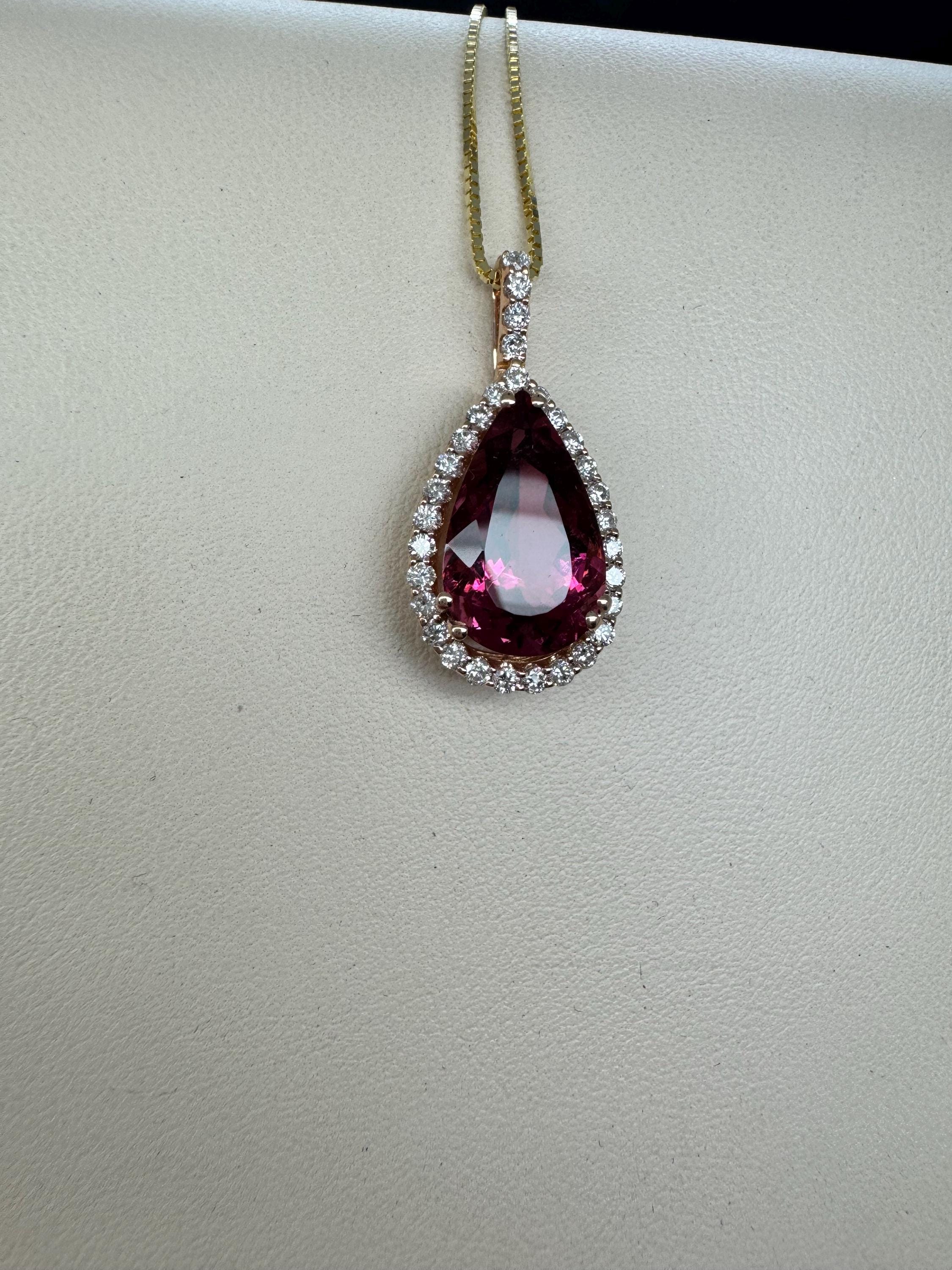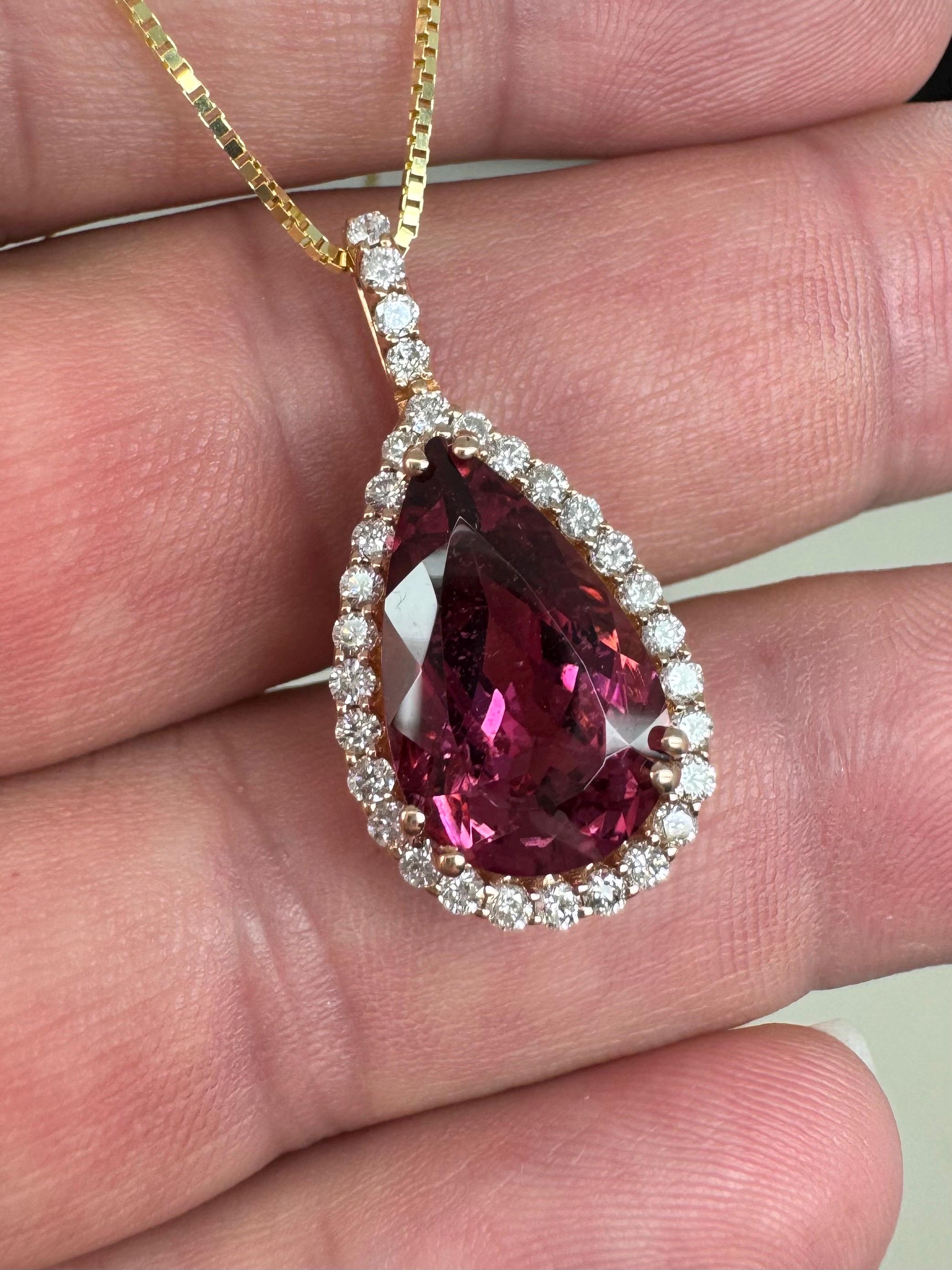 Seven carat brazilin rubellite Tourmaline. 3/4 carat natural diamond accents. All in 14k gold.
