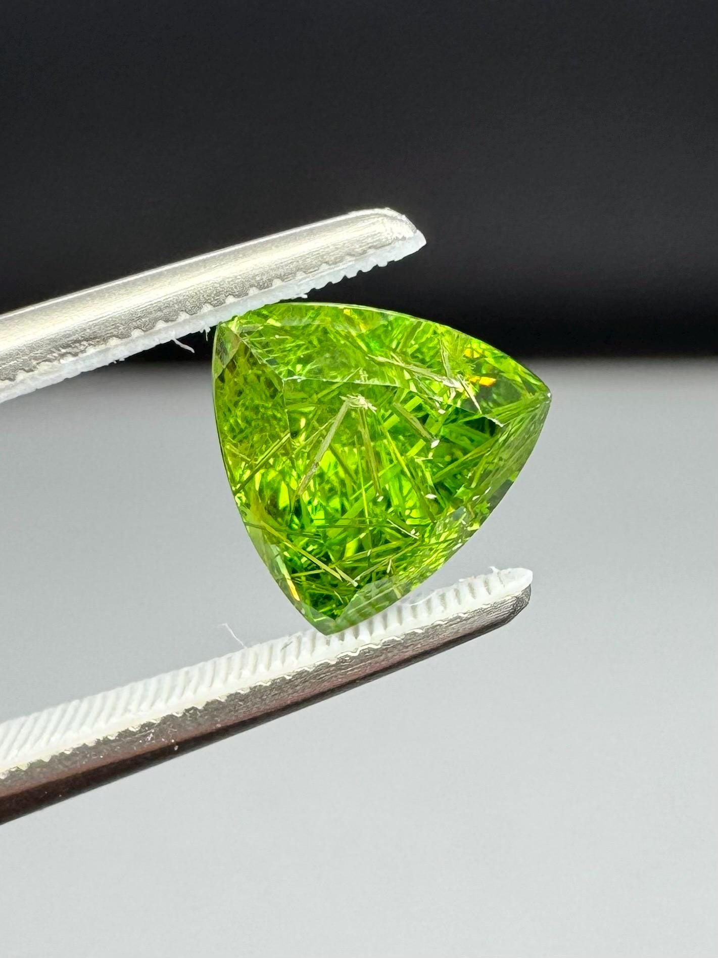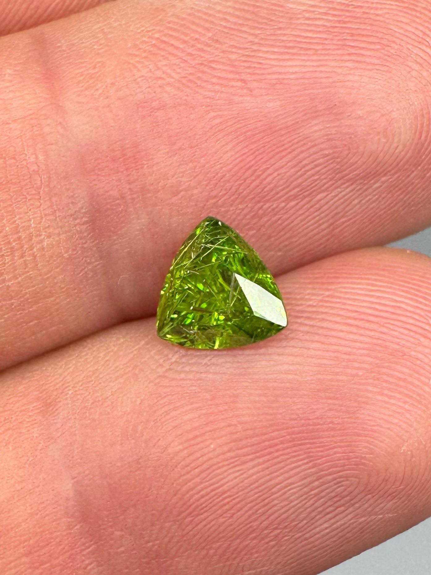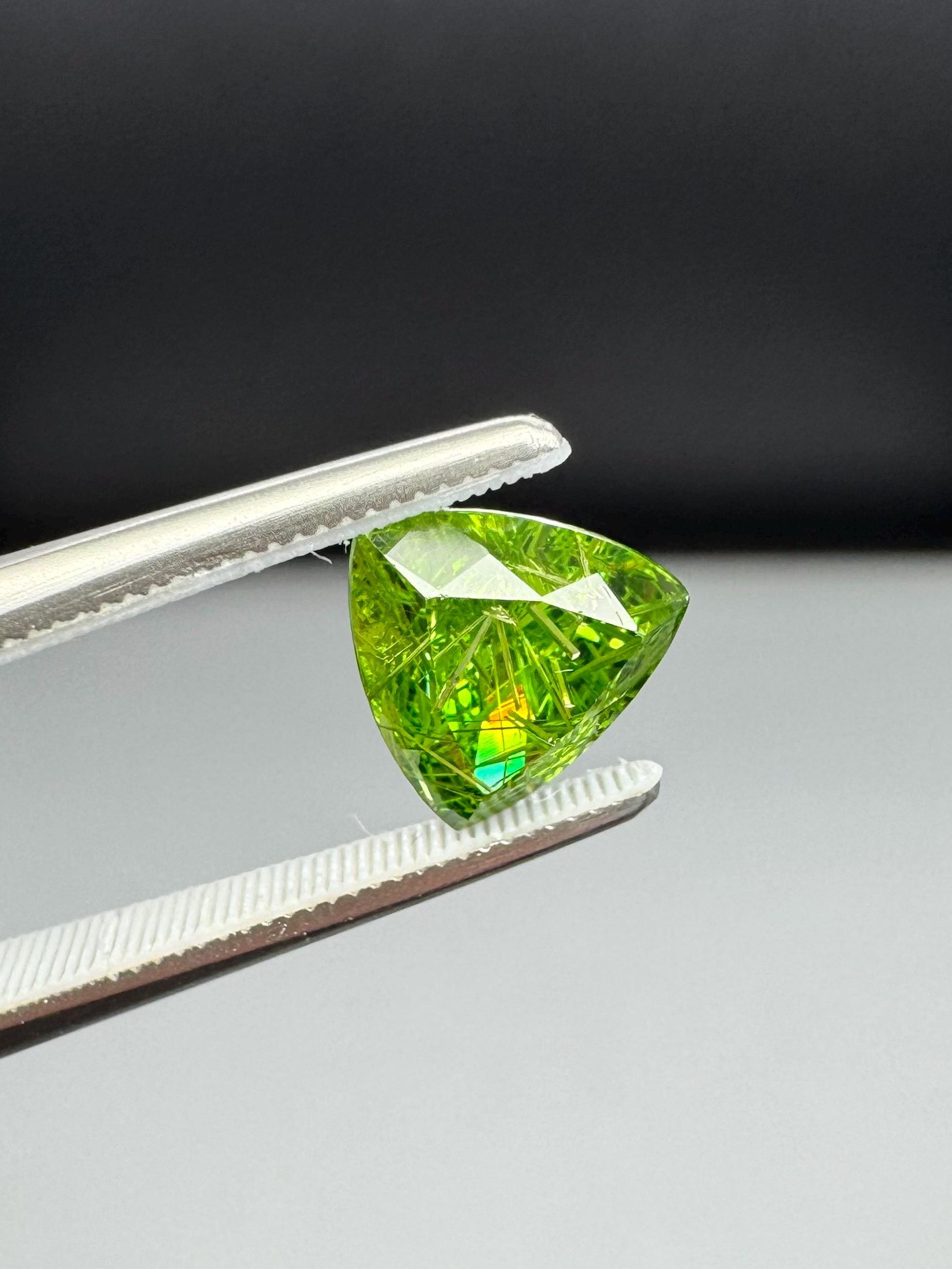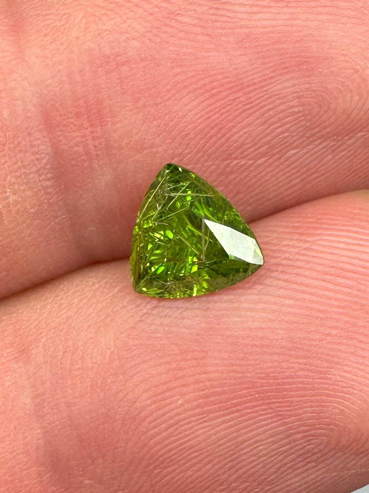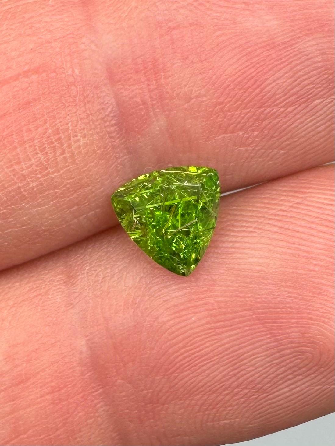 An extremely rare demantoid showing off a rare conglomerate of the very inclusions that give them the horsetail moniker. In the gem world, a fine horsetail can increase the value of a demantoid dramatically, sometimes doubling or tripling the price. The crystals themselves are byssolite. Very rare formation indeed.