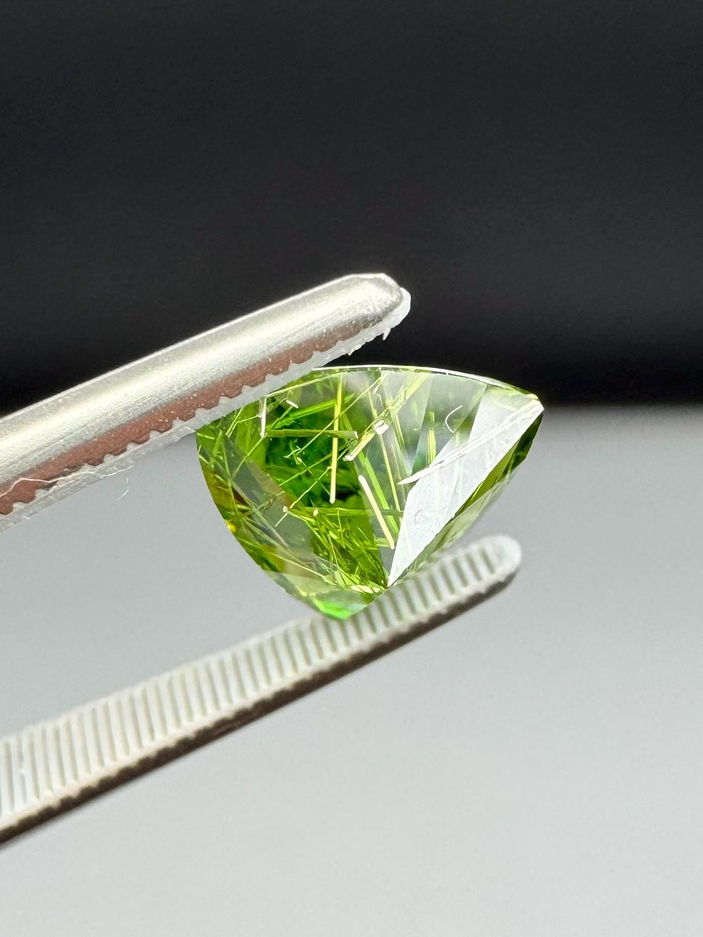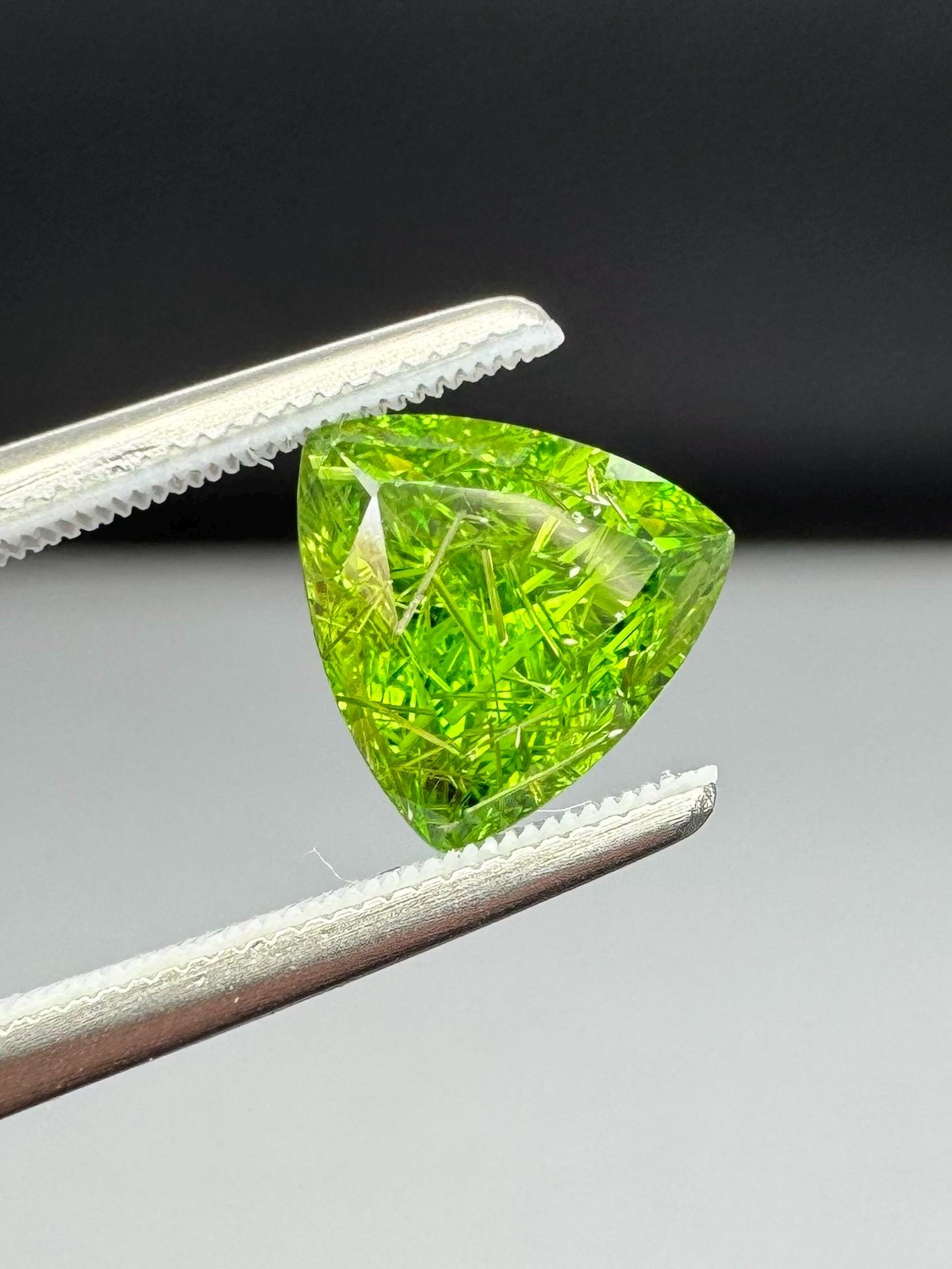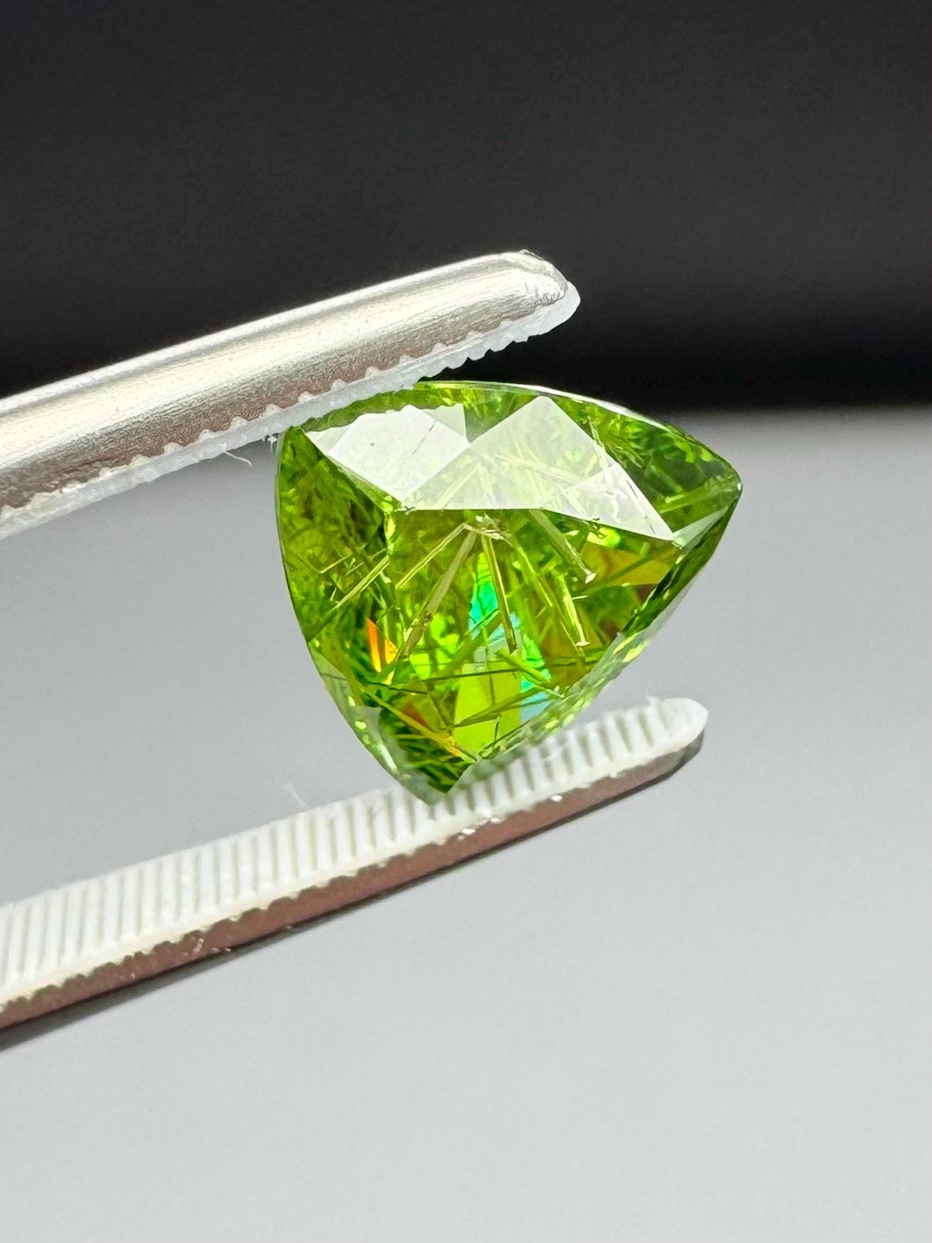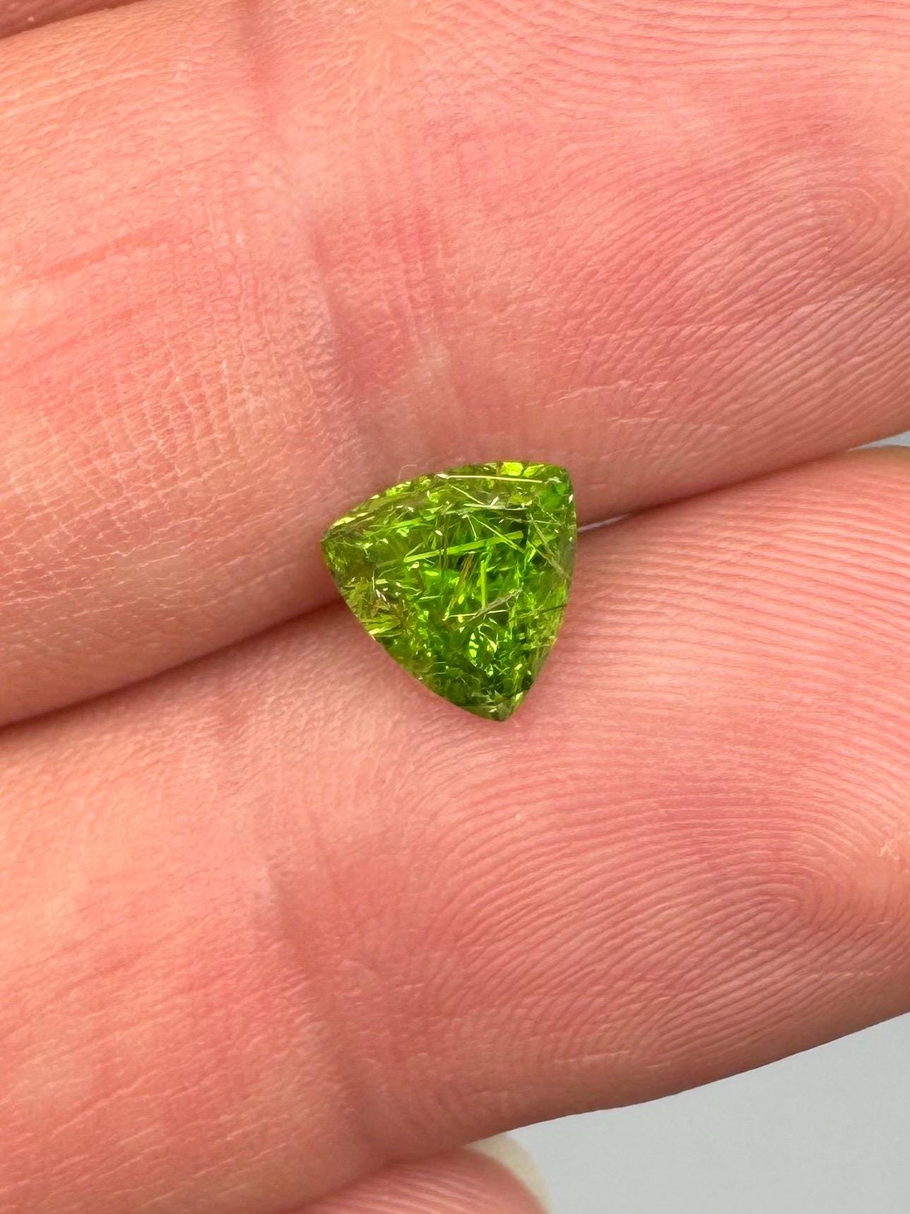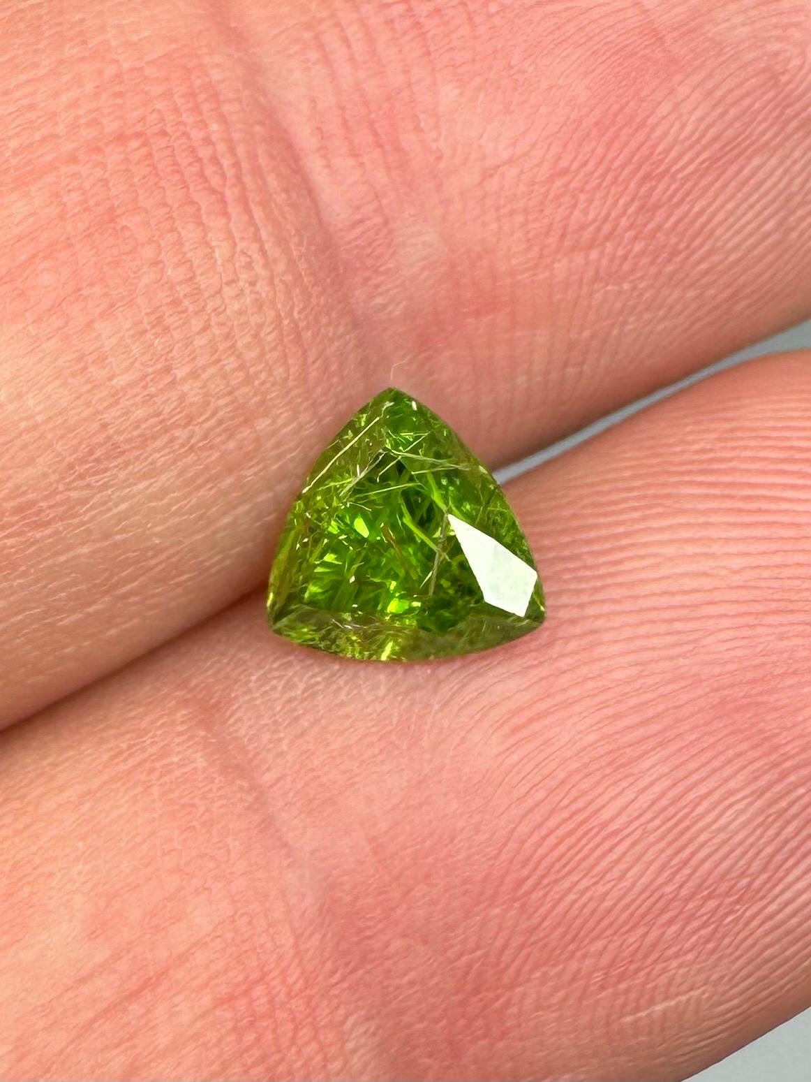 An extremely rare demantoid showing off a rare conglomerate of the very inclusions that give them the horsetail moniker. In the gem world, a fine horsetail can increase the value of a demantoid dramatically, sometimes doubling or tripling the price. The crystals themselves are byssolite. Very rare formation indeed.