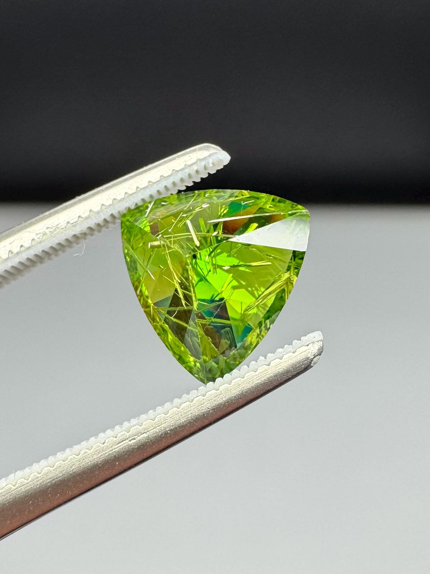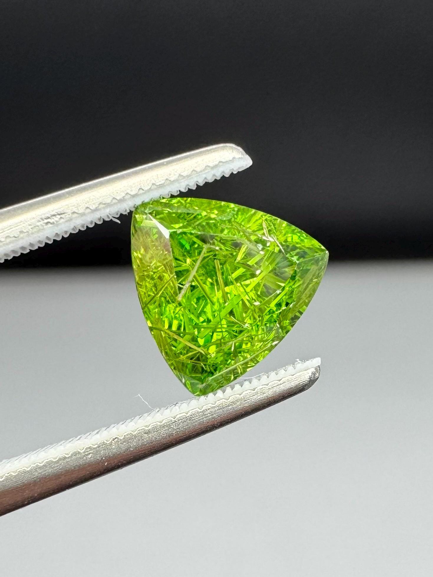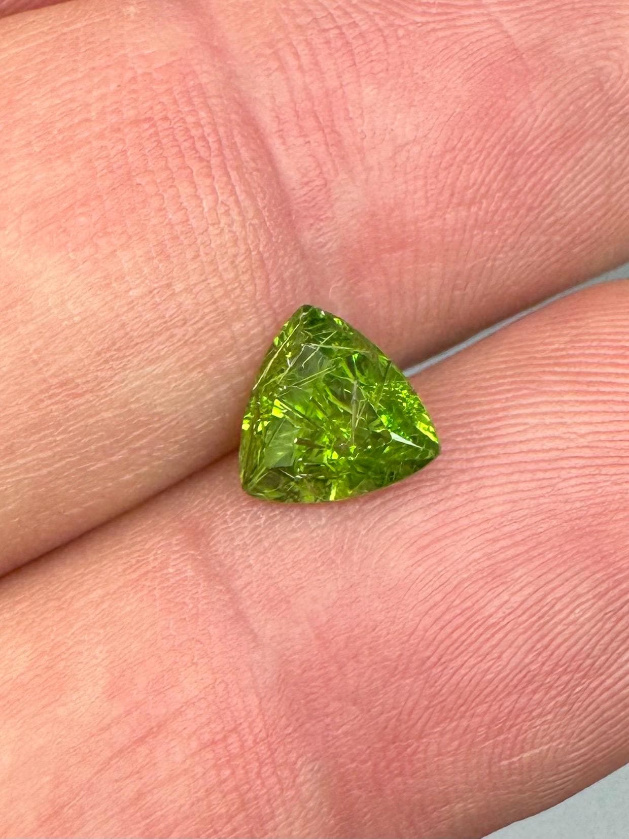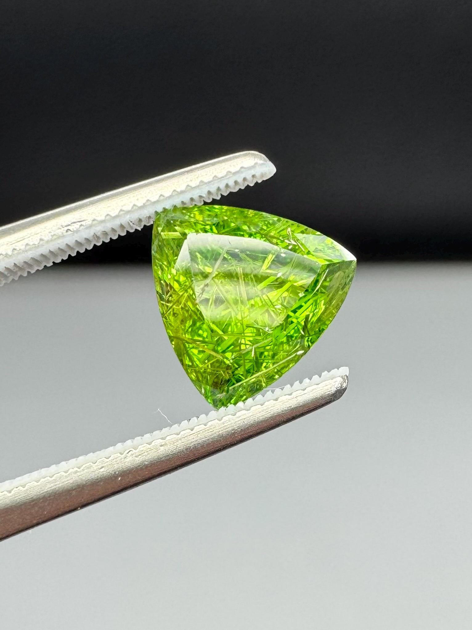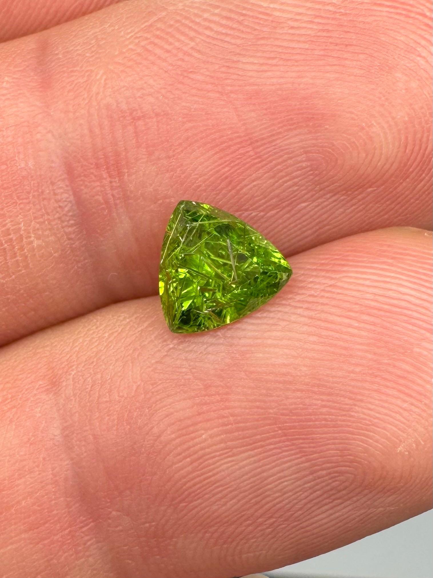 An extremely rare demantoid showing off a rare conglomerate of the very inclusions that give them the horsetail moniker. In the gem world, a fine horsetail can increase the value of a demantoid dramatically, sometimes doubling or tripling the price. The crystals themselves are byssolite. Very rare formation indeed.