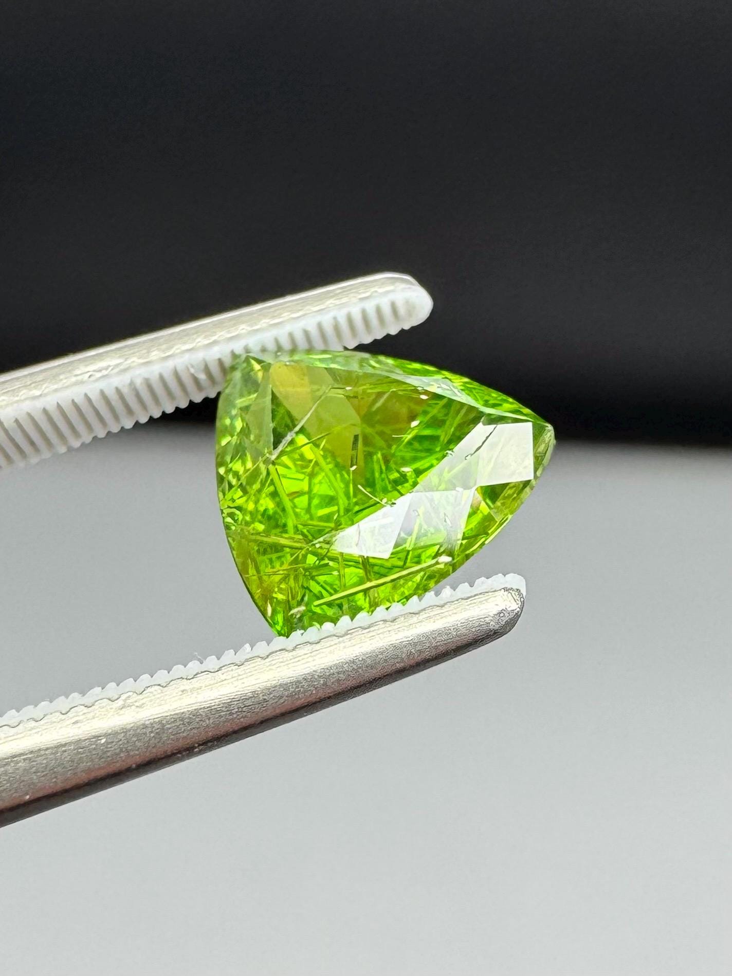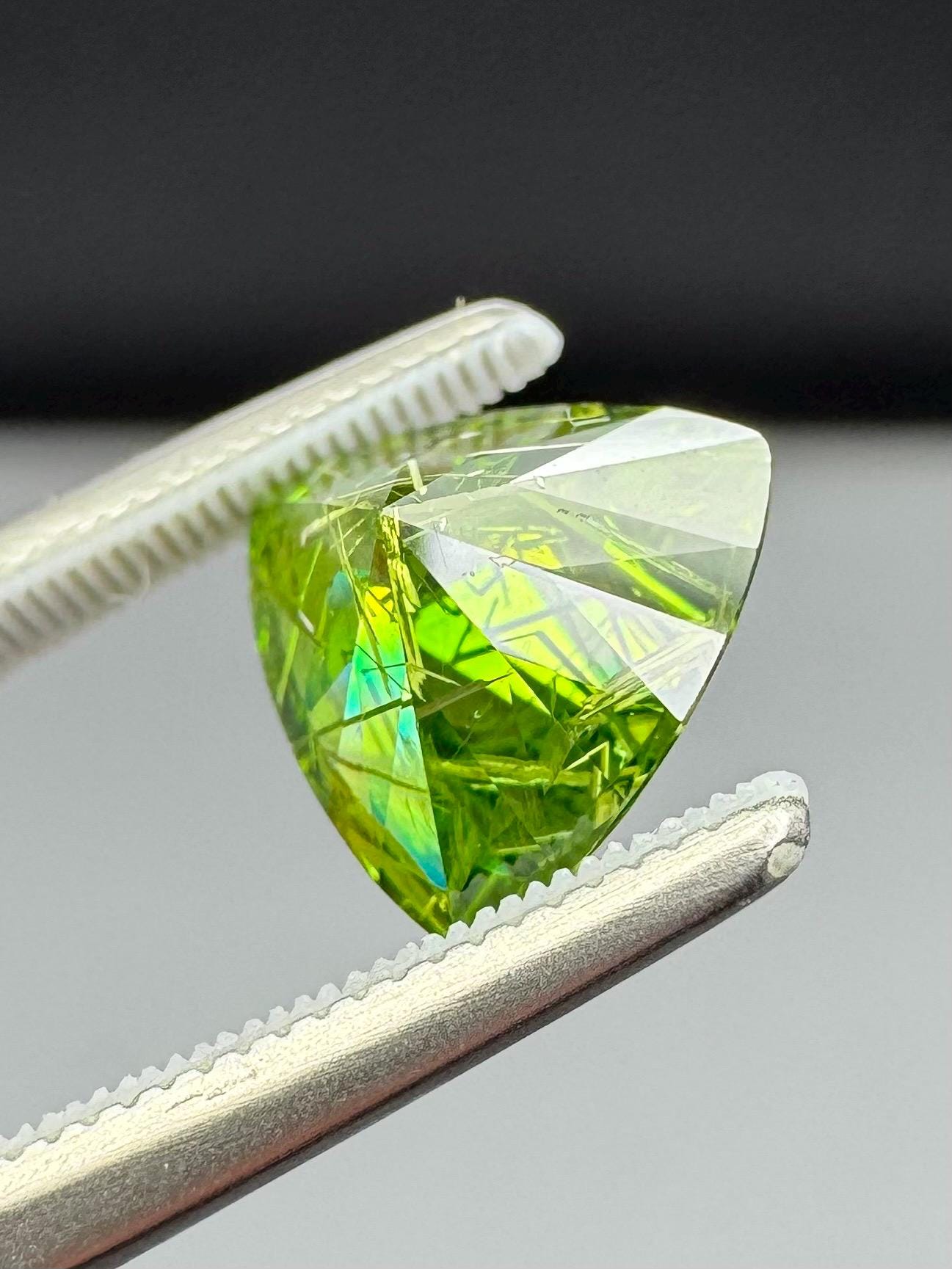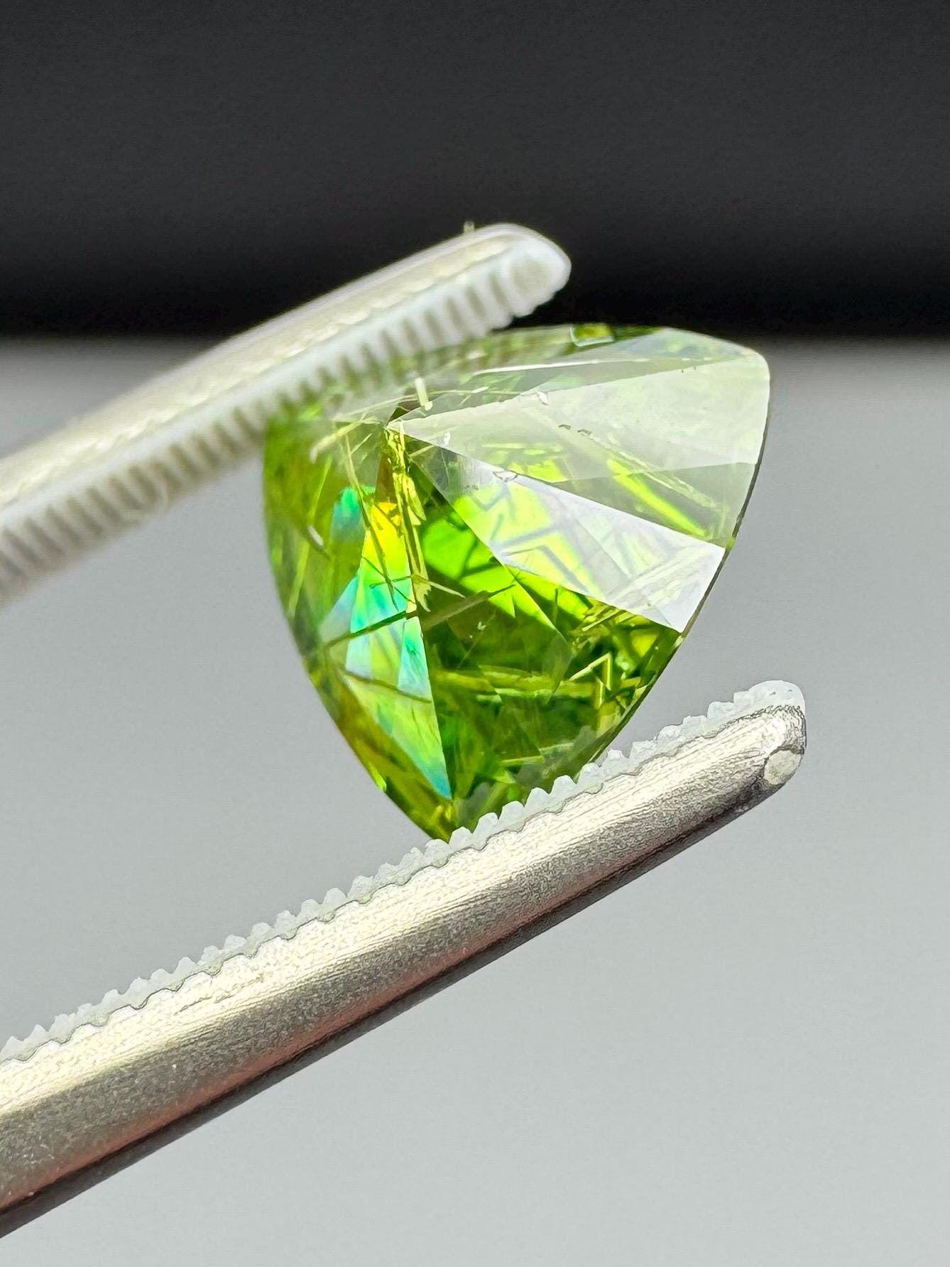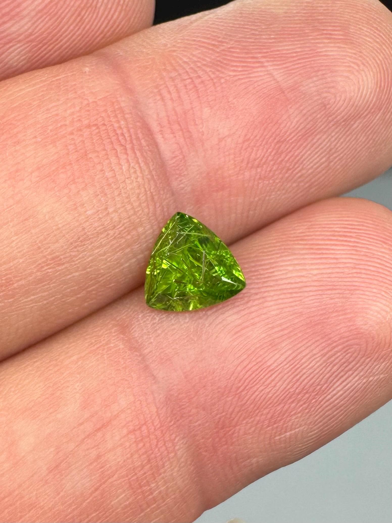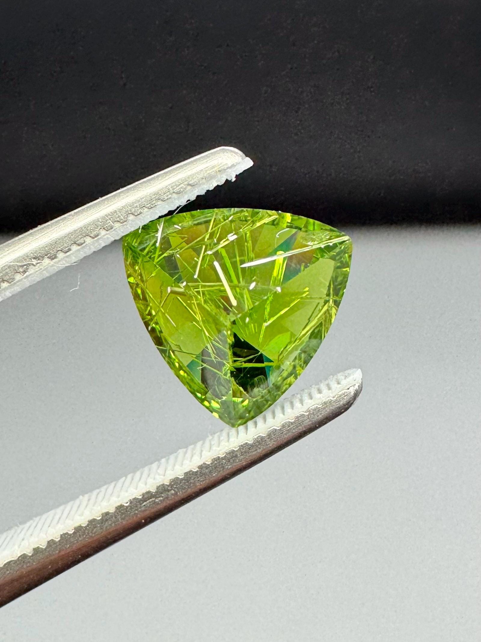 An extremely rare demantoid showing off a rare conglomerate of the very inclusions that give them the horsetail moniker. In the gem world, a fine horsetail can increase the value of a demantoid dramatically, sometimes doubling or tripling the price. The crystals themselves are byssolite. Very rare formation indeed.