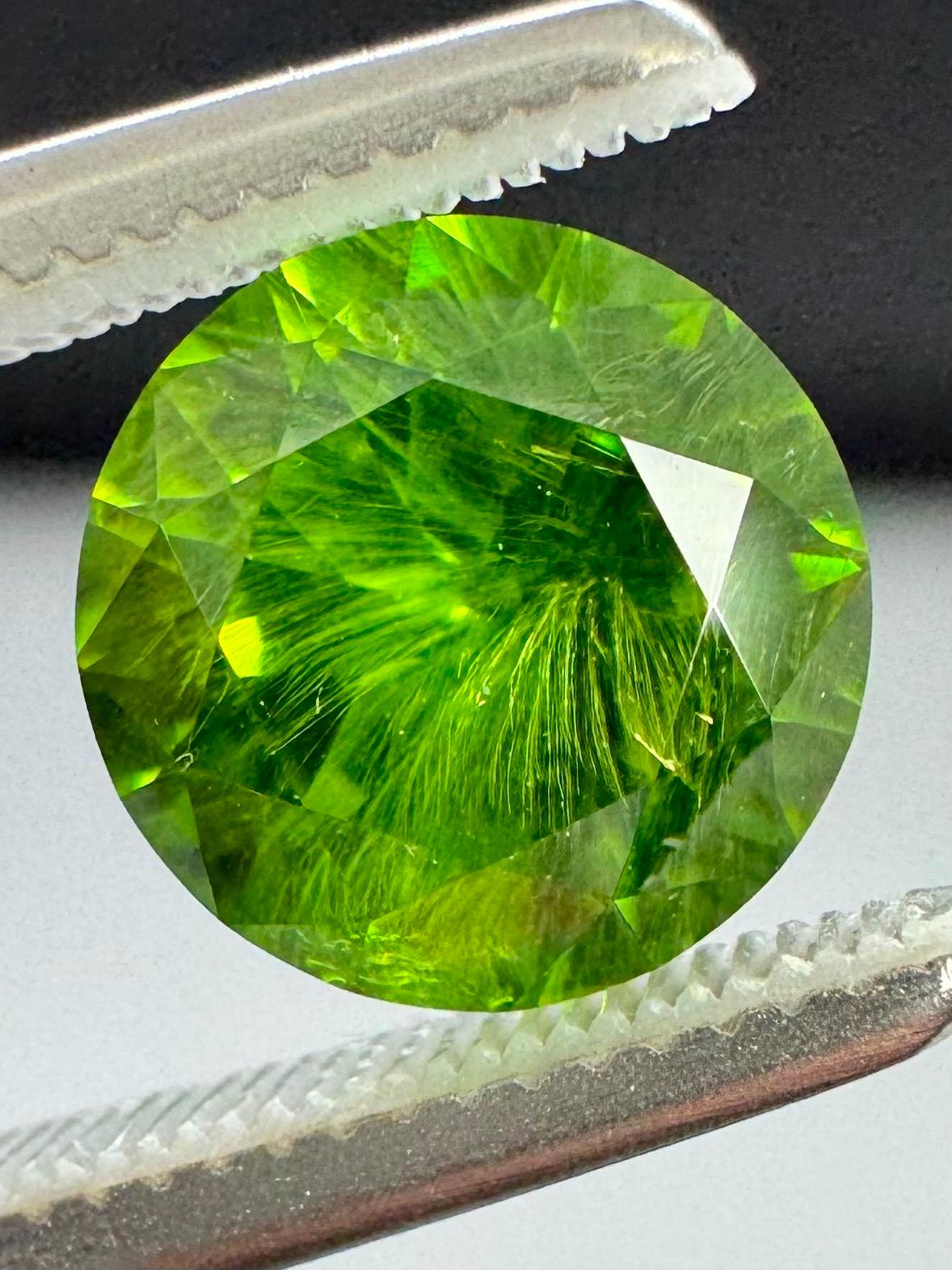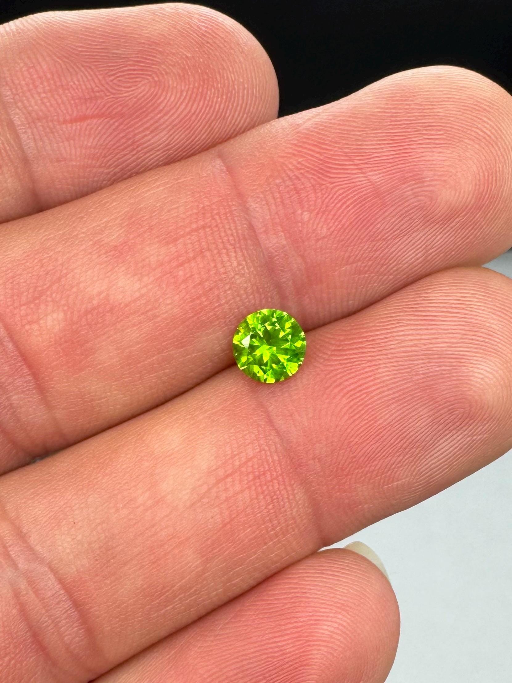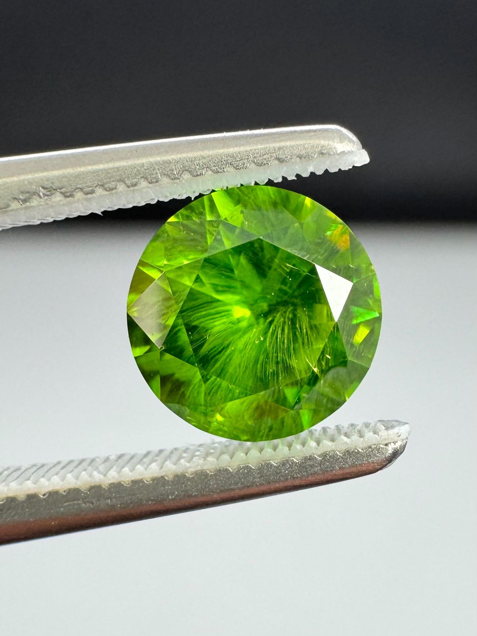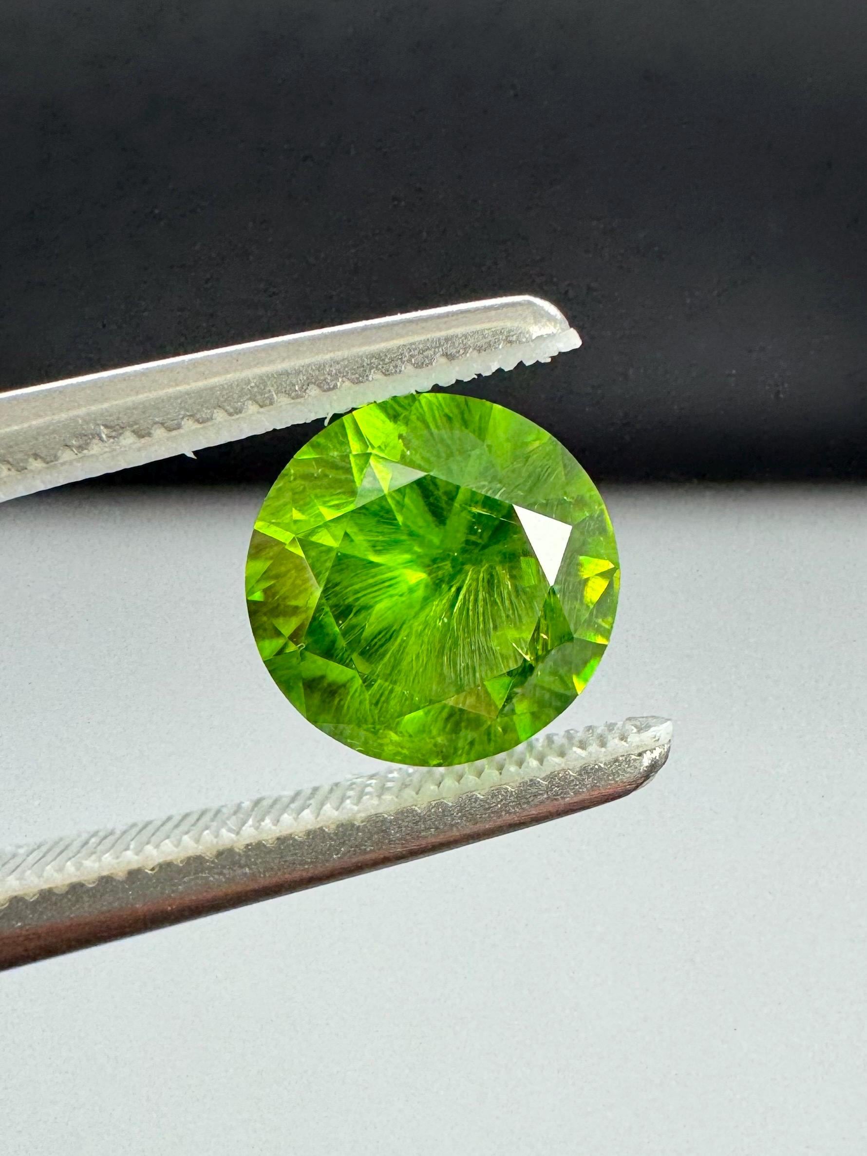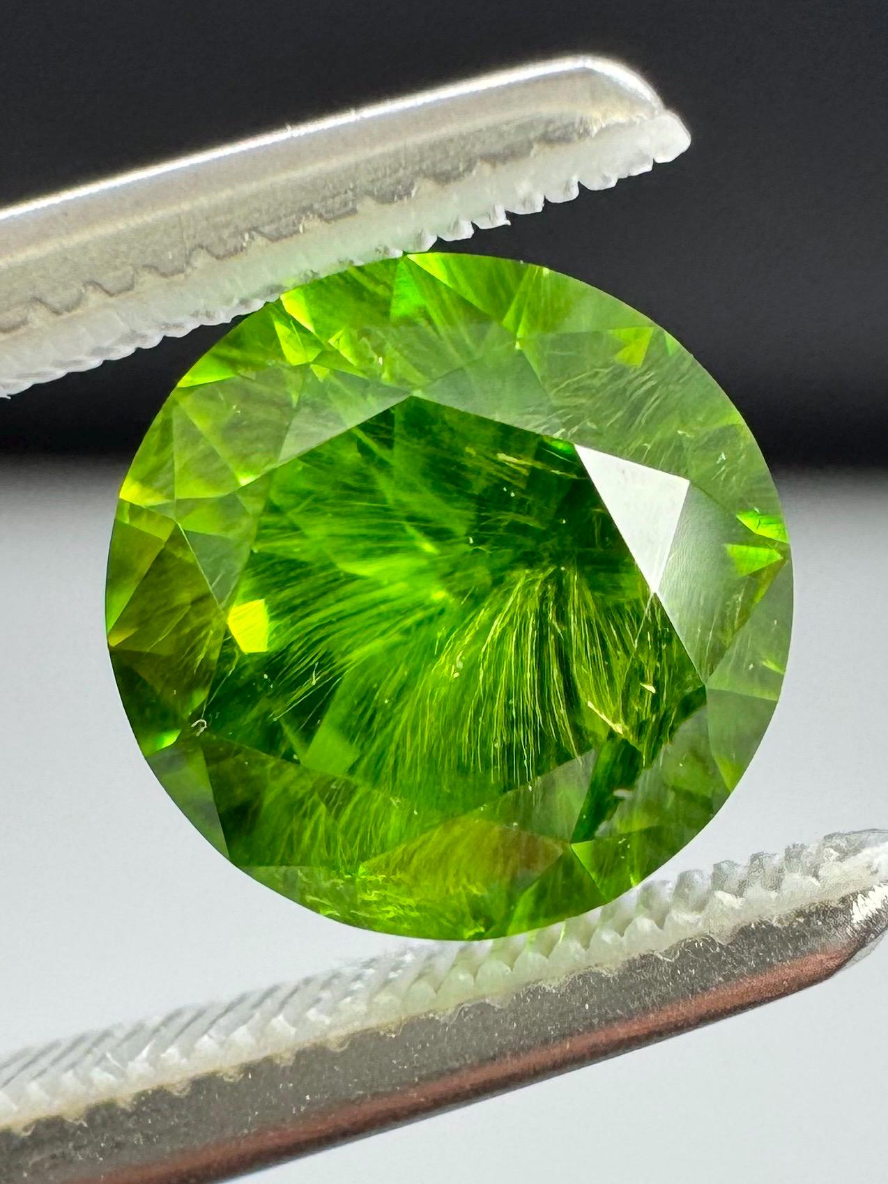 Perfect example of a demantoid with the horsetail inclusions. 6mm 1ct. Untreated obviously. Just an amazing color with a modern cut. A true gem.